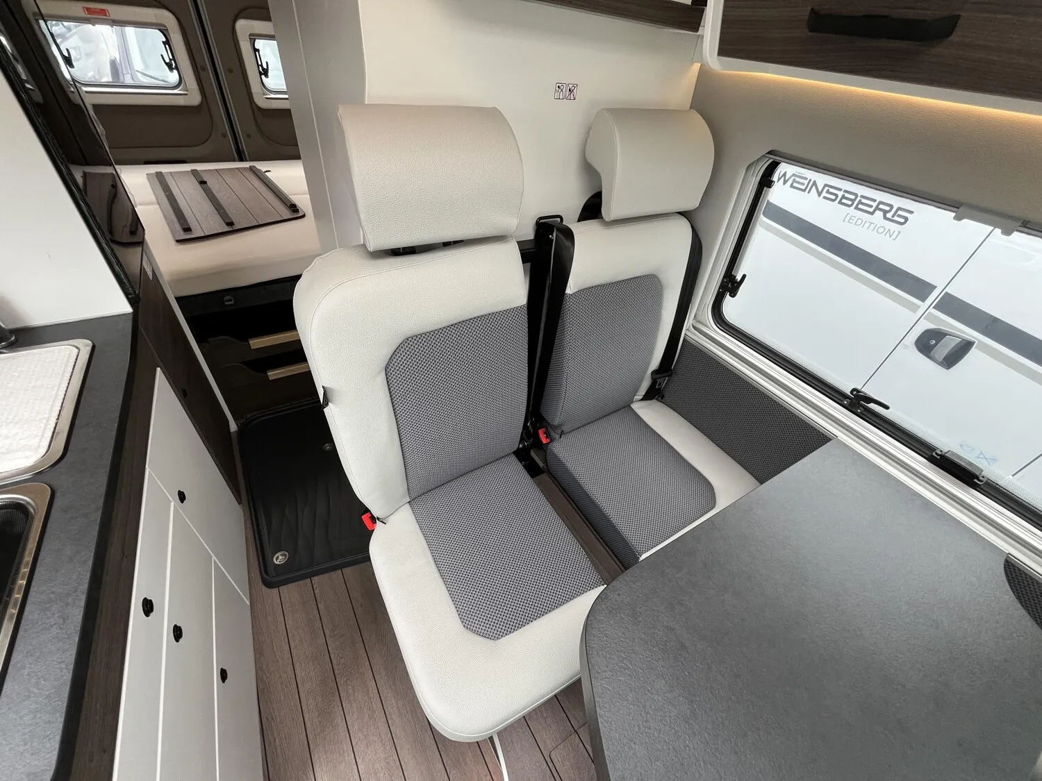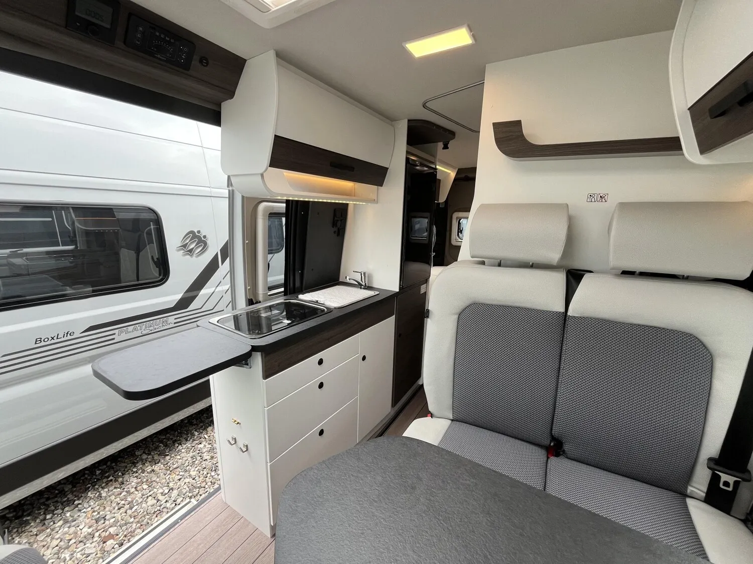 - Comfort Paket: Kraftstofftank 90l, REMIS Fahrerhausverdunkelung für Front- und Seitenscheibe, Fliegenschutztür an der Schiebetür, Vorverkabelung SAT / Solar, Vorverkabelung Rückfahrkamera, 16" –Stahlräder, 16" , Radblenden, USB-Ladesteckdose, Lederlenkrad mit Schaltknauf in Leder, Lenkradfernbedienung, Taschen im Bettbereich, Tisch mit ausschwenkbarer Tischverlängerung, Isofix, Sitzbank seitlich ausziehbar für komfortablere Sitzposition, Armaturentafel in Techno Trim silber, Truma CP-Plus-Bedienteil, zusätzliche Steckdosen 2x 230V / 1x 12V