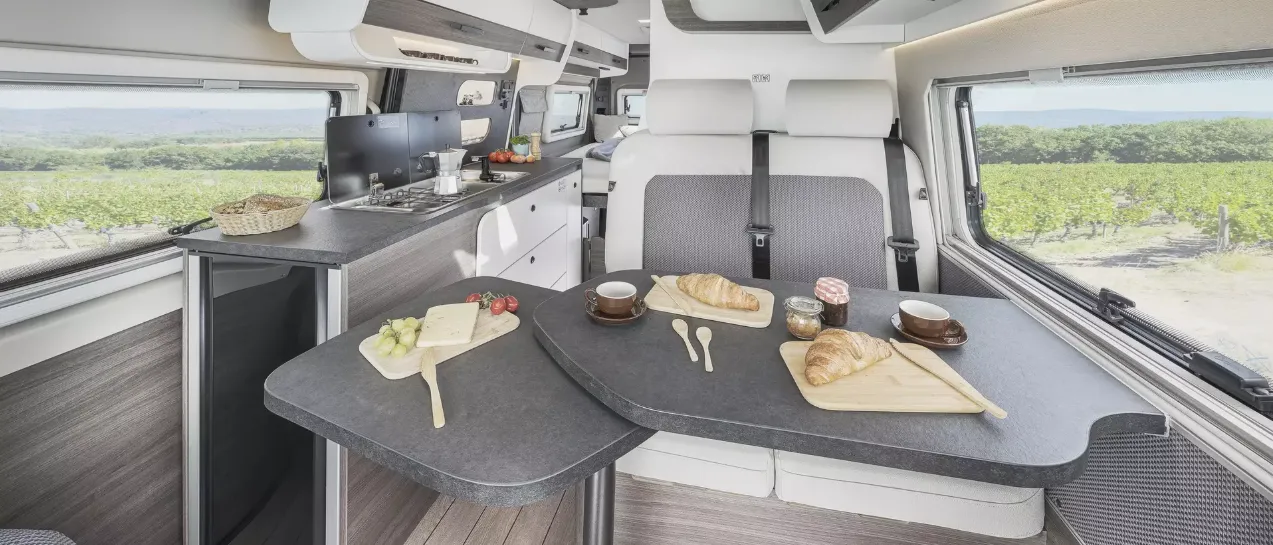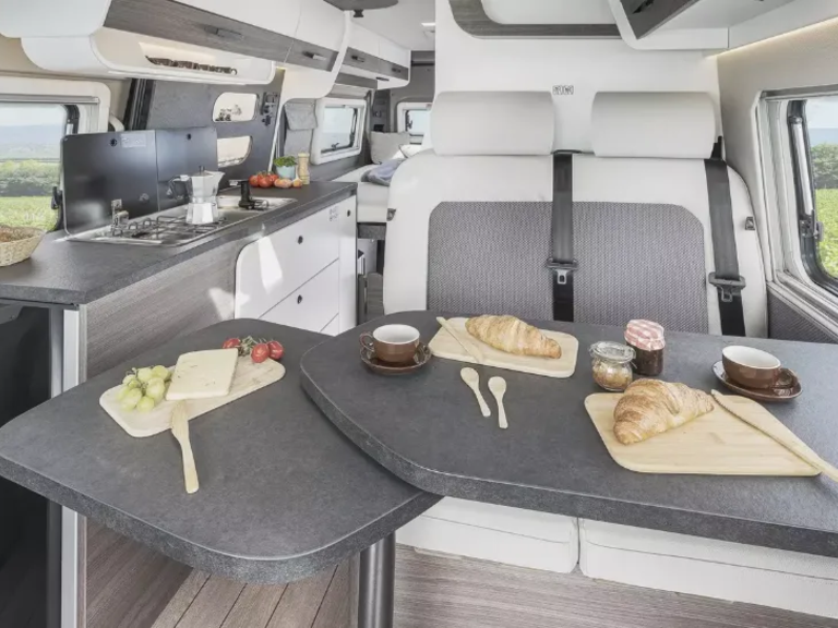 Radiovorbereitung mit Lautsprecher im Fahrerhaus, DAB Antenne, Vorverkabelung Solar (PV), REMIS Fahrerhausverdunkelung für Front-/Seitenscheiben, Fliegen schutztür an Schiebetür, Lederlenkrad mit Schaltknauf in Leder, Lenkradfernbe dienung, Tasche(n) im Bettbereich (1 x bei 540 D/600 D, 2 x bei 600 L/630 L), Tisch mit ausschwenkbarer Tischverlängerung, 2 Isofix Kindersicherungen für die Sitzbank, Sitzbank seitlich ausziehbar, 2 Kleiderhaken im Bettbereich, Armaturen tafel in Techno Trim silber, Truma CP-Plus-Bedienteil, 16" Leichtmetallfelgen für Serienbereifung, zusätzliche Steckdosen 2 x 230 V/1 x 12 V