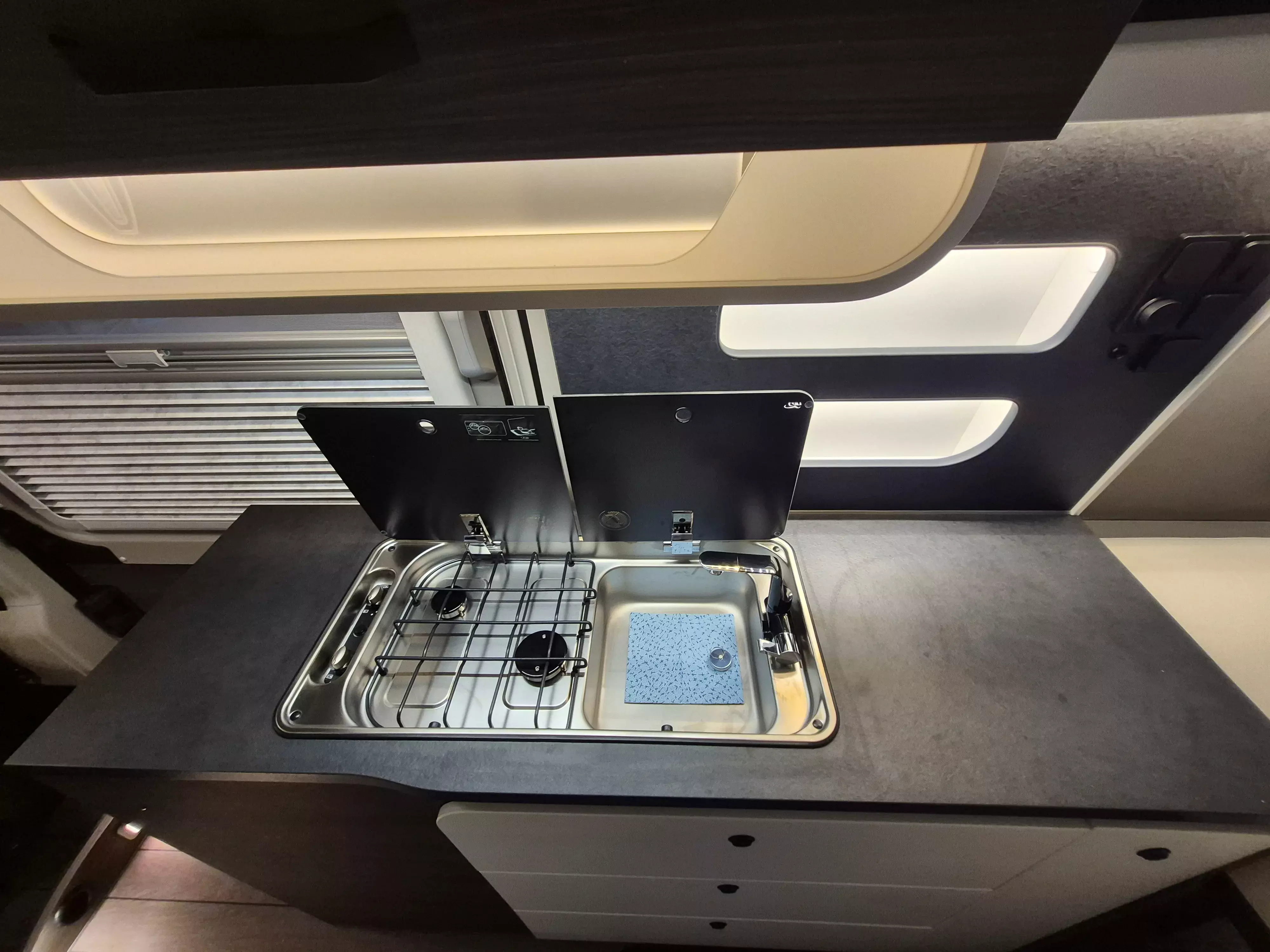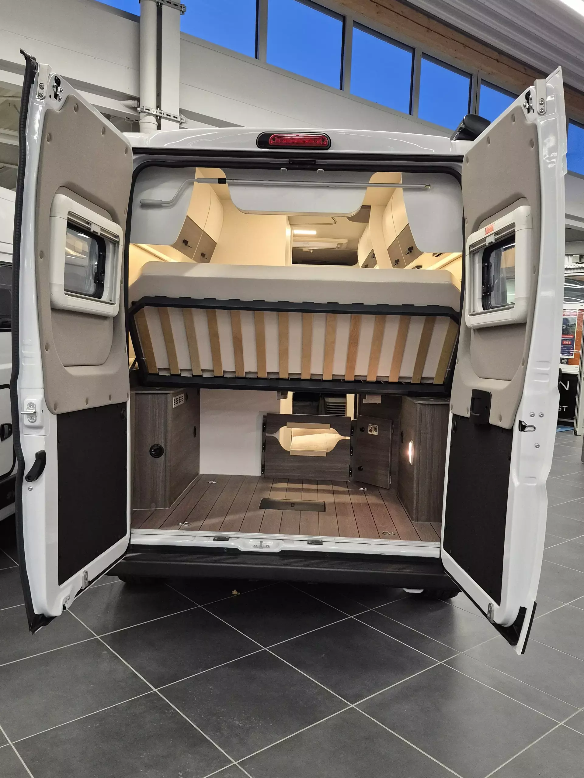 Nebelscheinwerfer, Frontstoßfänger in Wagenfarbe lackiert, Skid Plate/Spoilerlippe (nur Light Chassis), LED-Leseleuchten über Fahrer-/Beifahrersitz, Ambientebeleuchtung dimmbar inkl. Regenrinne über Schiebetür (inkl. LED-Beleuchtung