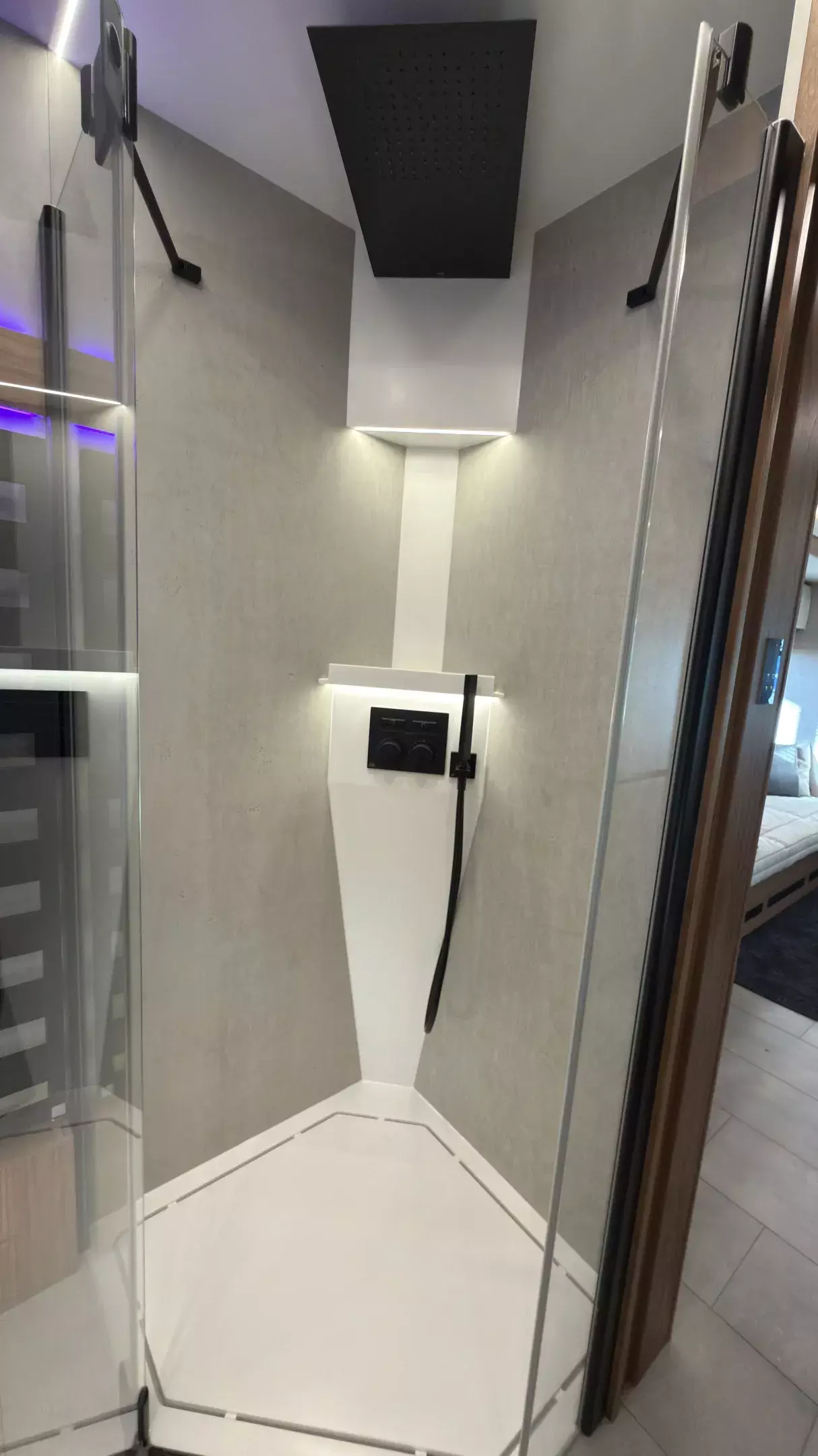 - CORIAN® / STARON® 5-Eck-Dusche im Boden flächenbündig eingelassen mit verdecktem Ablauf, Echtglas-Duschtür