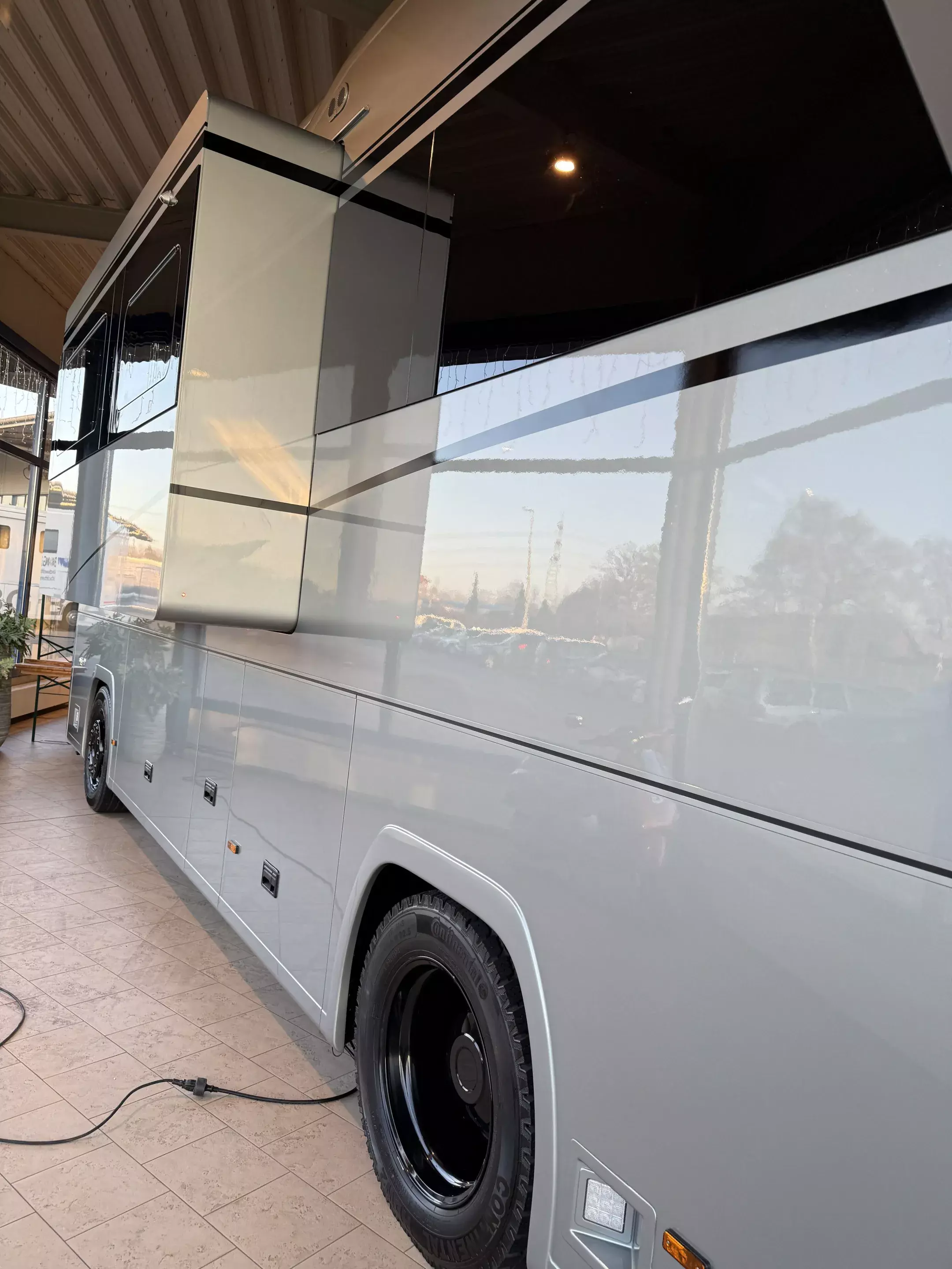 - Echtglas Fensterband an Seitenwänden, schwarz mit flächenbündig eingelassenen Ausstellfenstern, Schiebefenster vor Eingangstür, Schiebefenster im Fahrer- / Beifahrerbereich (Perfect >1000)