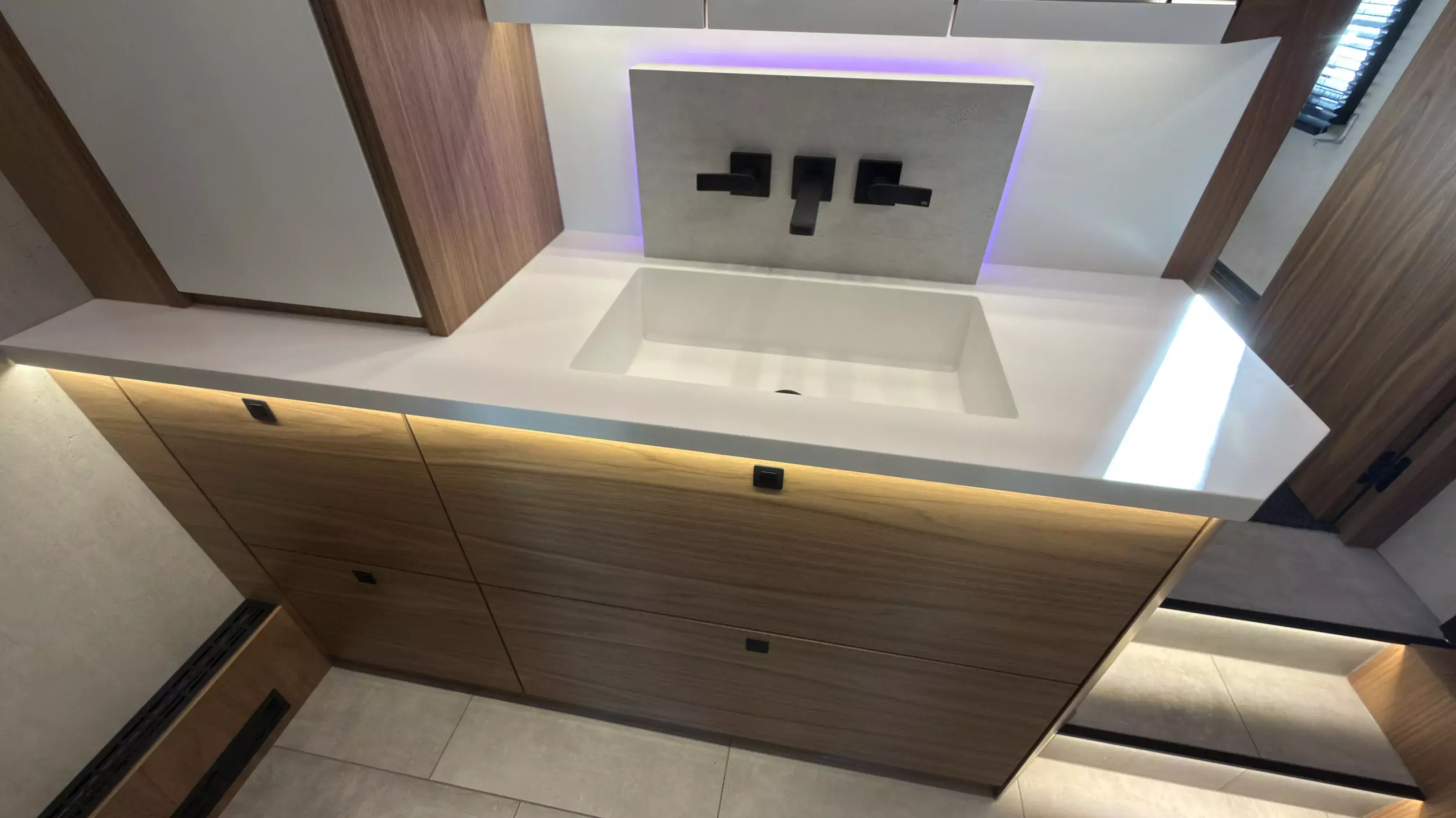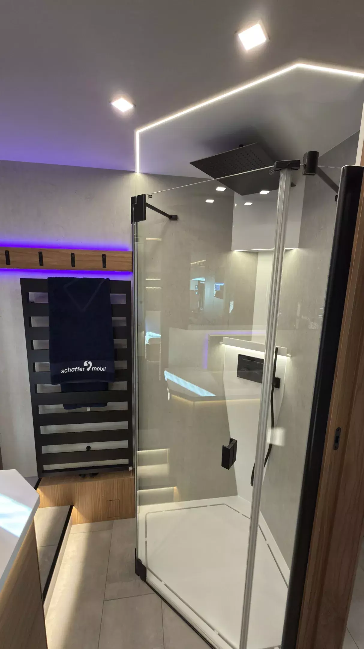 - Sonderbauweise Dusche, Gessi Duscharmaturen mit Rainshower Panel, indirekte LED-Beleuchtung bei Ablage, LED-Line Beleuchtung Decke