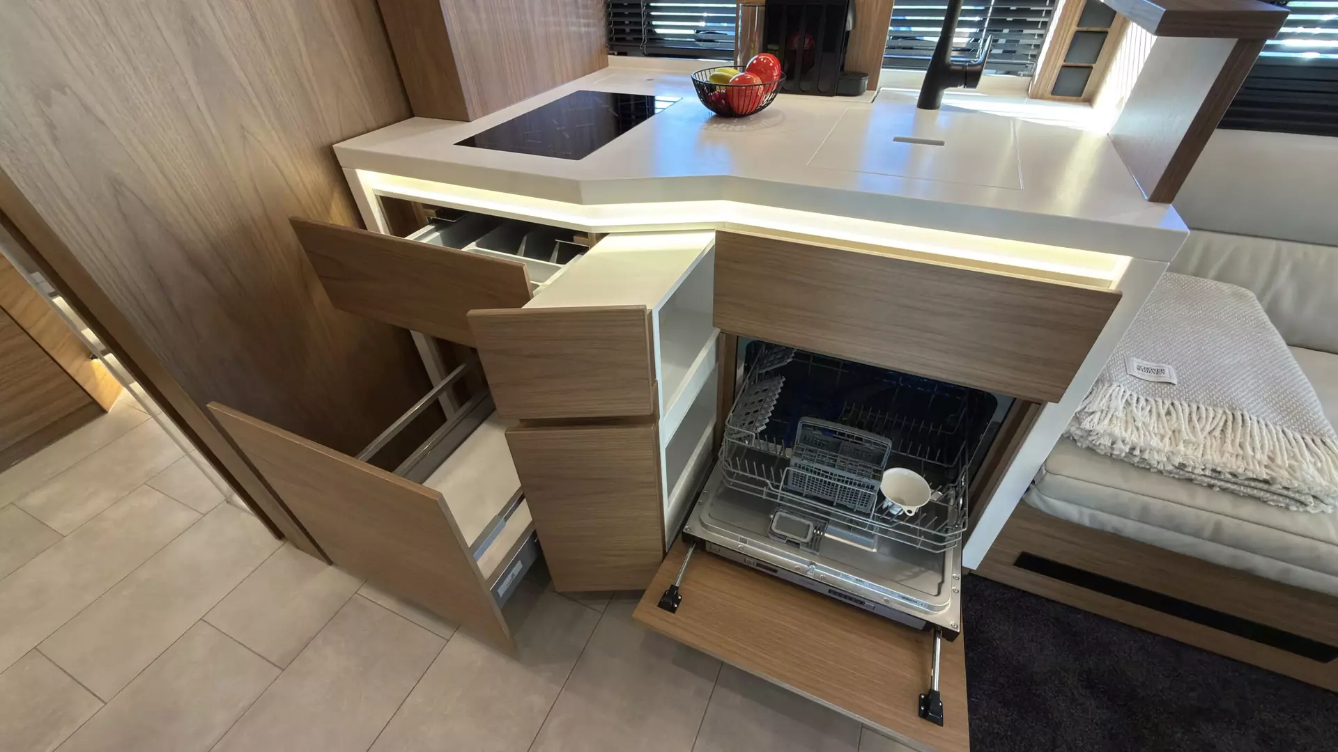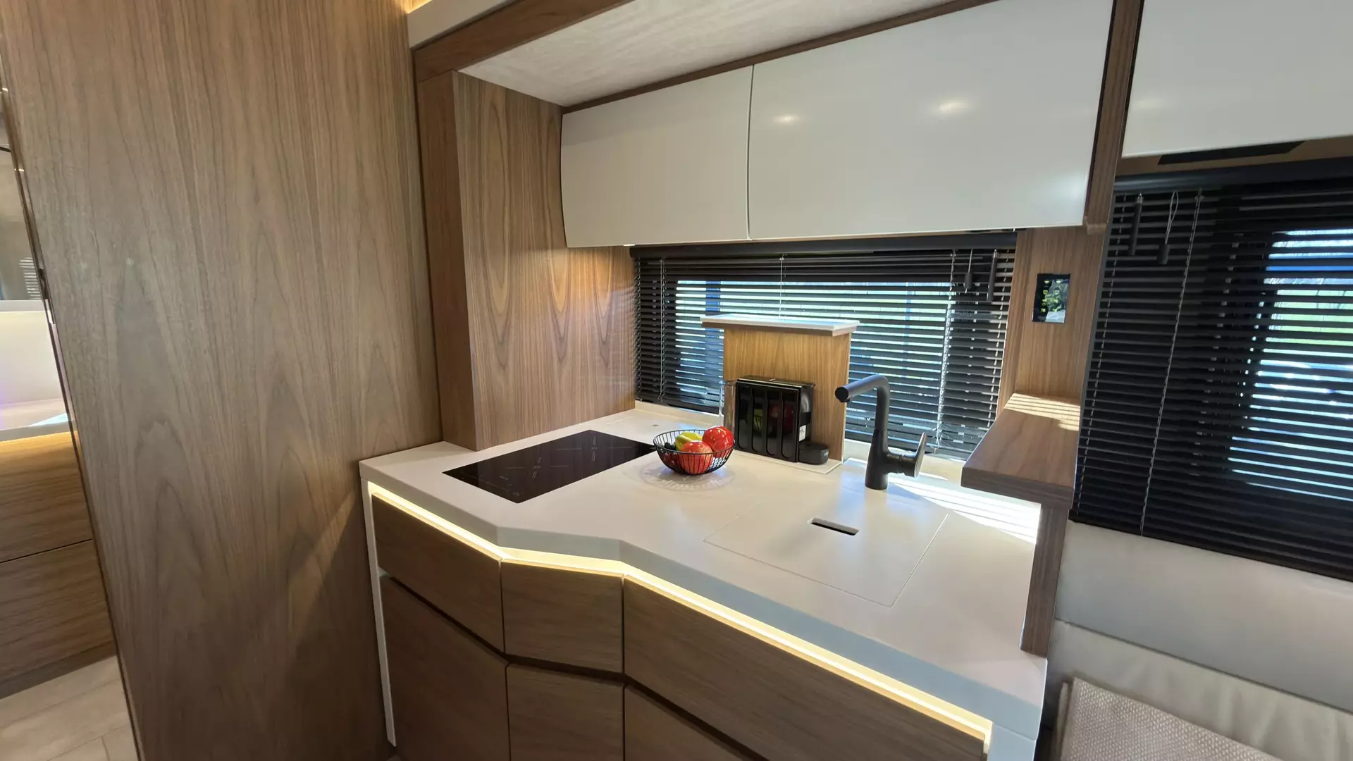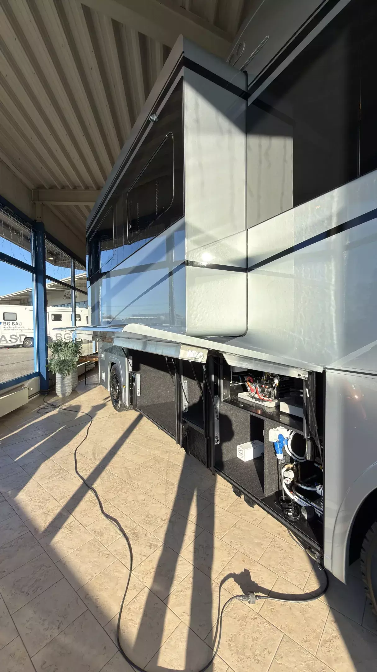 - Gelenkarmautomatikmarkise OMNISTOR 5,5 x 2,75 m, flächenbündig in Seitenwand eingelassen, elektrisch betätigt 230 V, Fernbedienung, lackiert in Wagenfarbe, Hängeschrankblenden im Bad