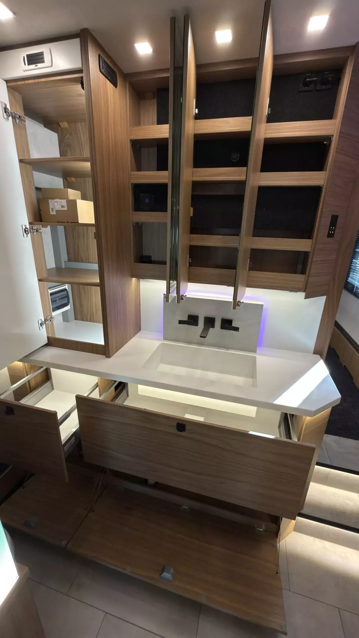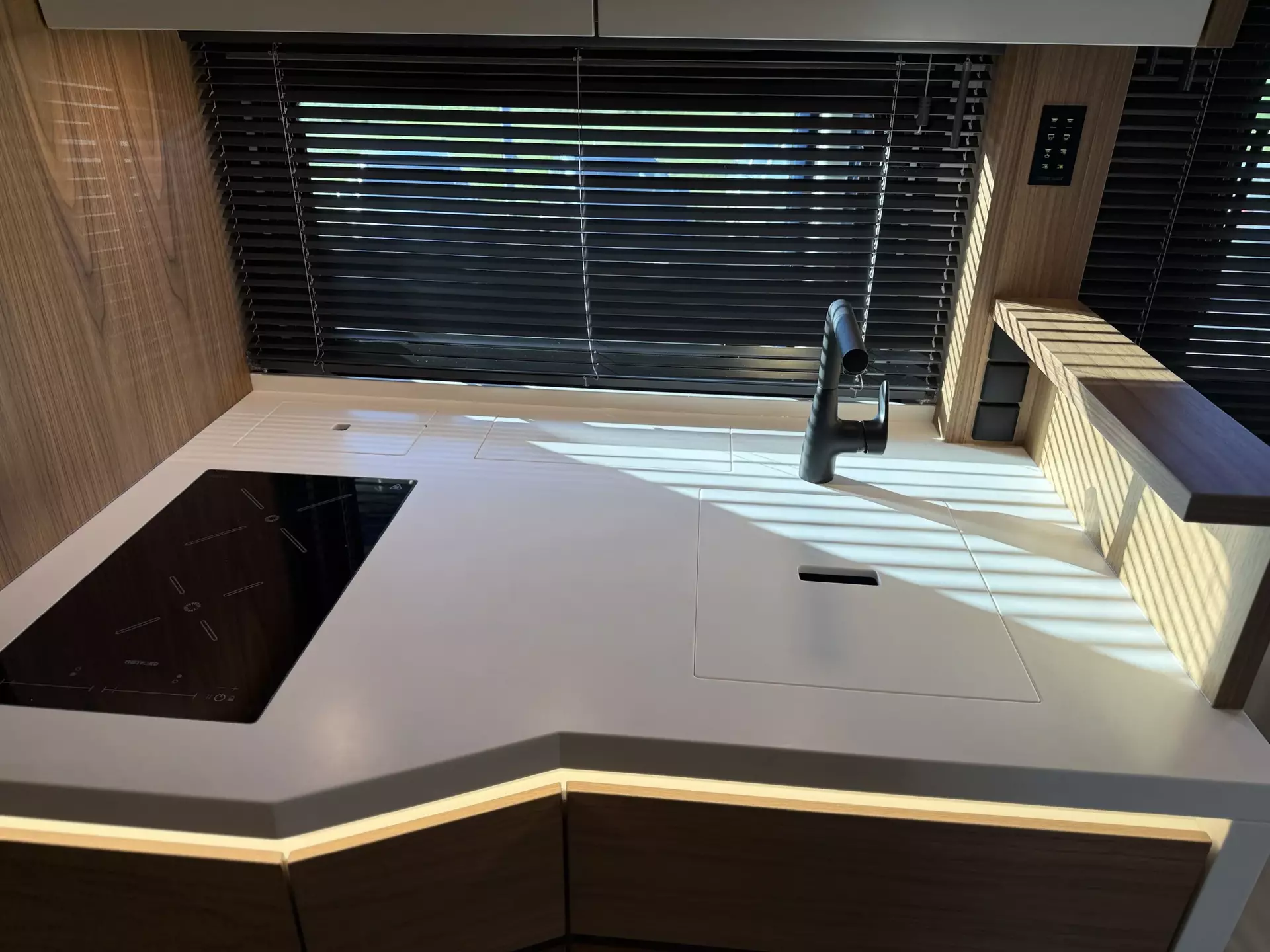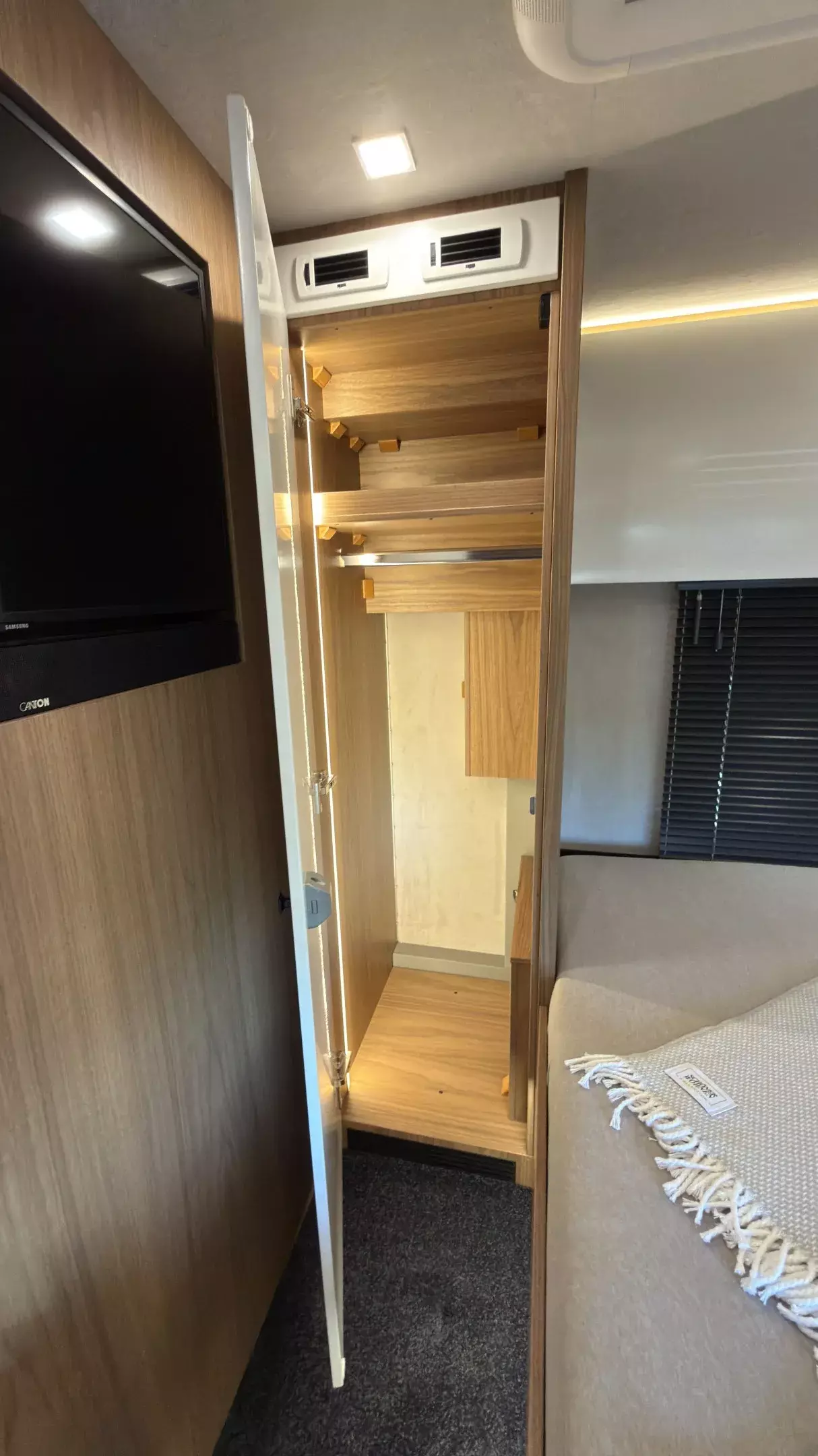 - Gelenkarmautomatikmarkise OMNISTOR 5,5 x 2,75 m, flächenbündig in Seitenwand eingelassen, elektrisch betätigt 230 V, Fernbedienung, lackiert in Wagenfarbe, Hängeschrankblenden im Bad