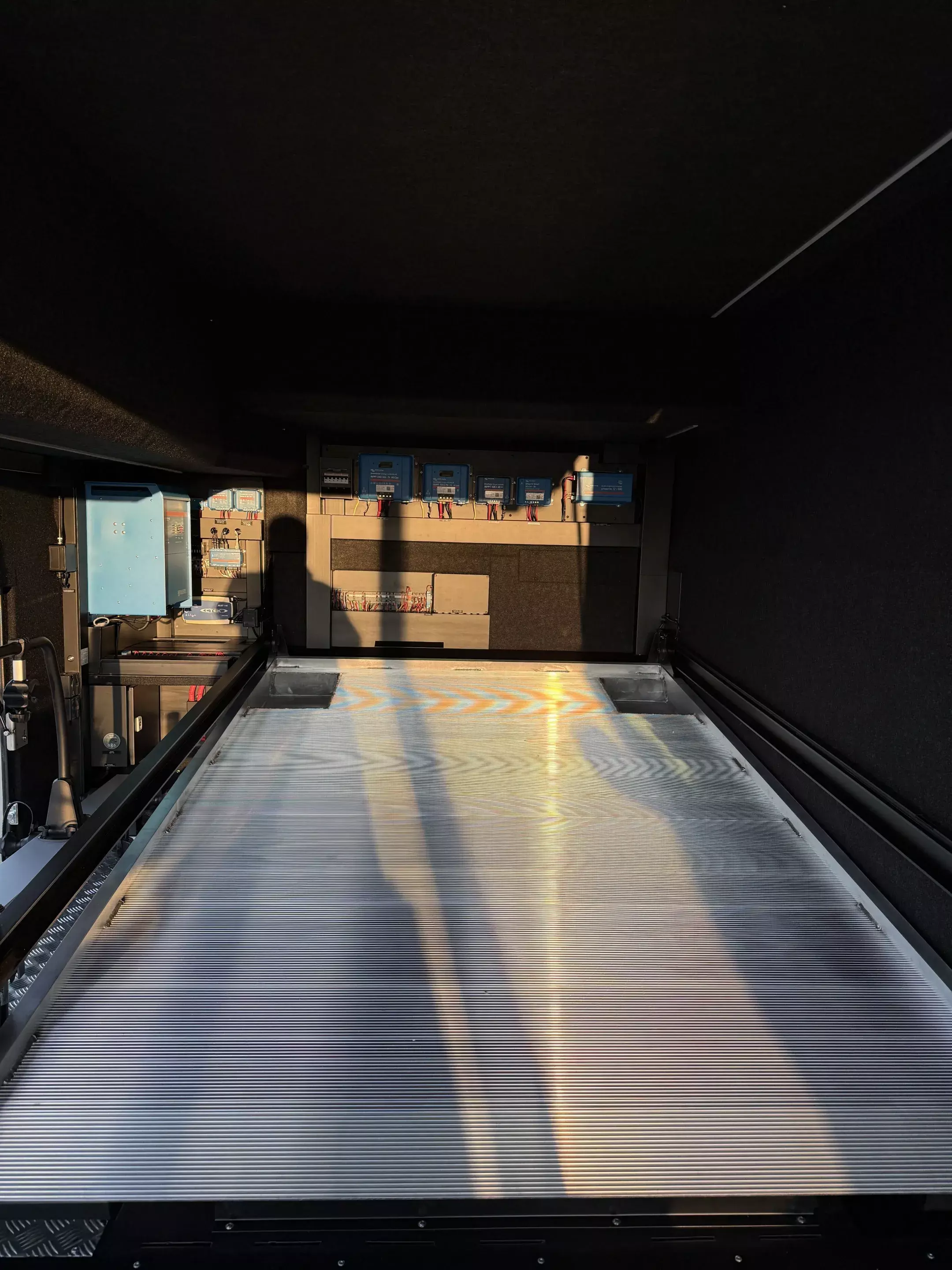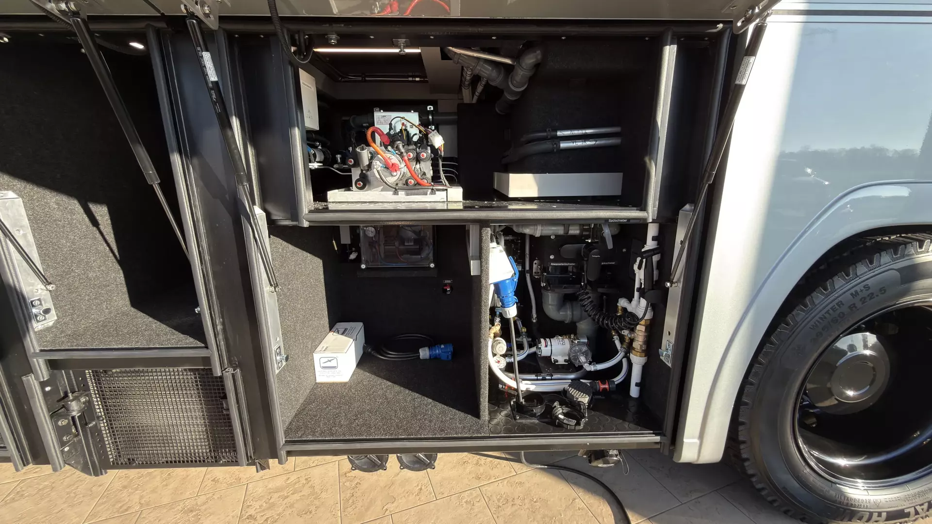 - Slide Out - hydraulisch ausfahrbarer Erker auf Fahrerseite (Unterbodenstauräume bleiben voll erhalten) mit pneumatischem Dichtungssystem, Oberflächenheizung 12 V in Dach und Stirnseiten zum Dichtungssystem, Oberflächenheizung 12 V in Dach und Stirnseiten zum Abtauen von Schnee und Eis im Winter, verstärkte Gitterrohr-Rahmen-Abtauen von Schnee und Eis im Winter, verstärkte Gitterrohr-Rahmen- konstruktion des Fahrgestells