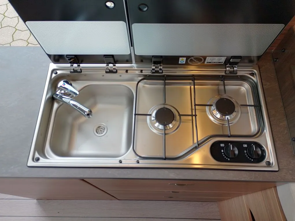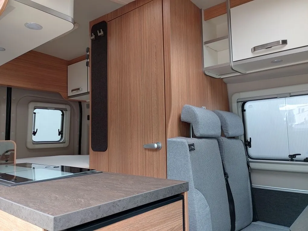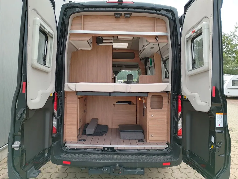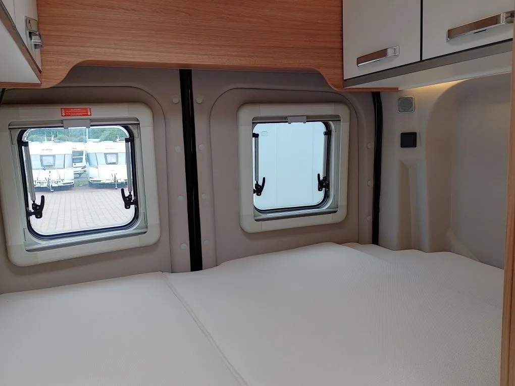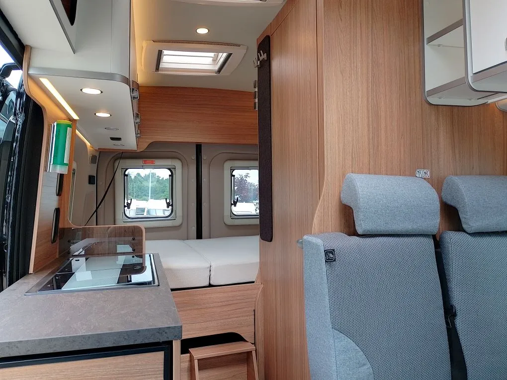 - (Ambientebeleuchtung im Wohnraum/Nasszelle, Regenrinne über der Schiebetür mit LED (dimmbar), USB-Steckdosen, im Küchenbereich, 230 V SCHUKO-Steckdose zusätzlich, im Heck)