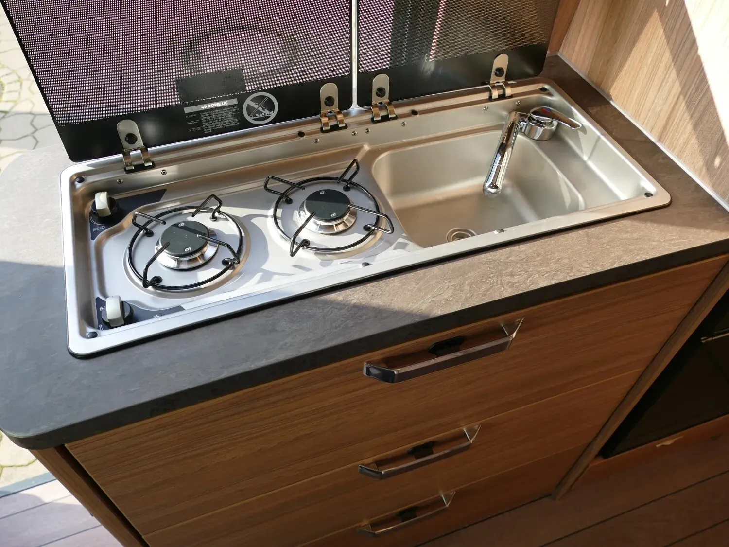 - Function-Paket (Tisch ausdrehbar, klappbare Kleiderstange in Nasszelle an Dach und 2 Kleiderhaken, Küchenarbeitsplatte mit abklappbarer Verlängerung und 2 Taschenhalter)