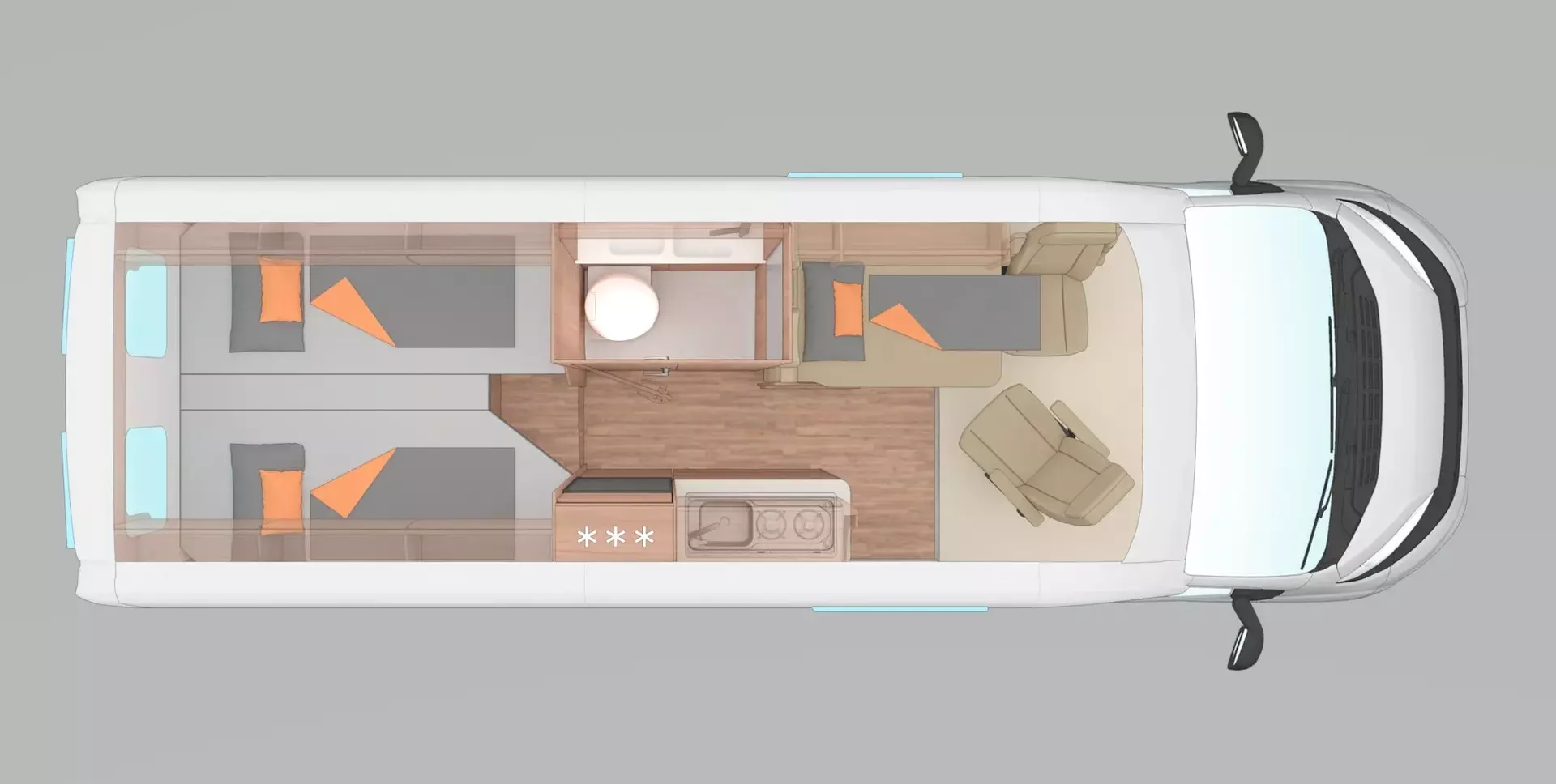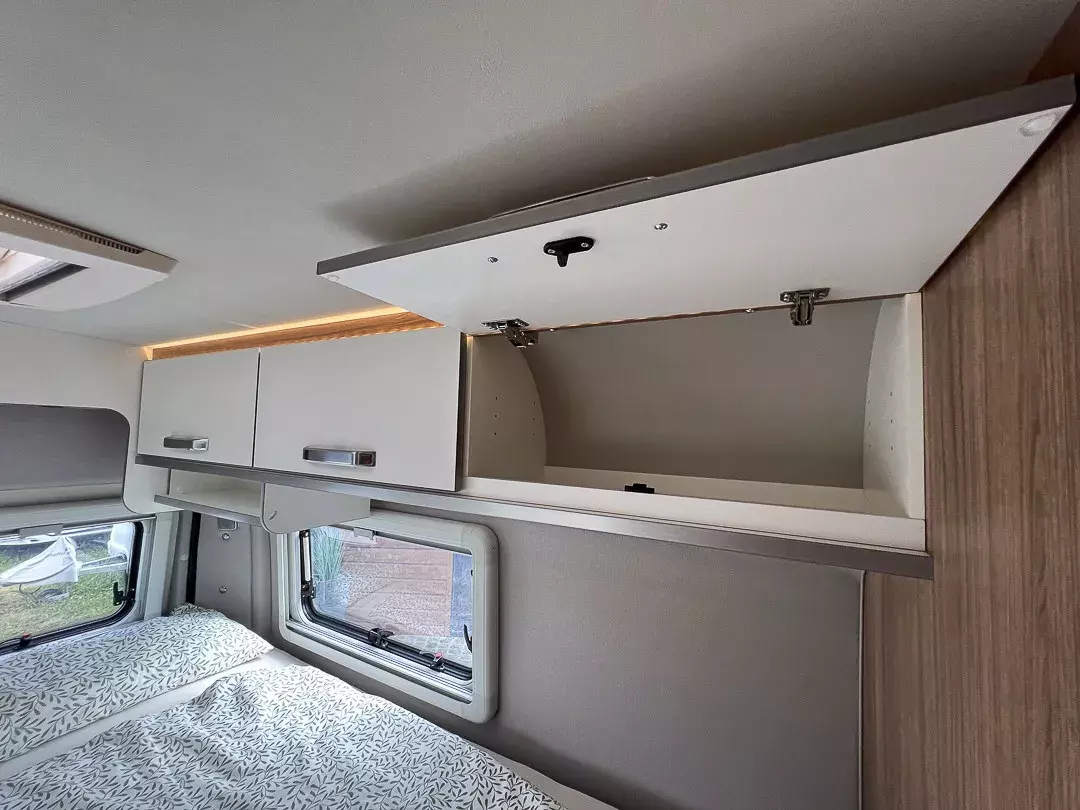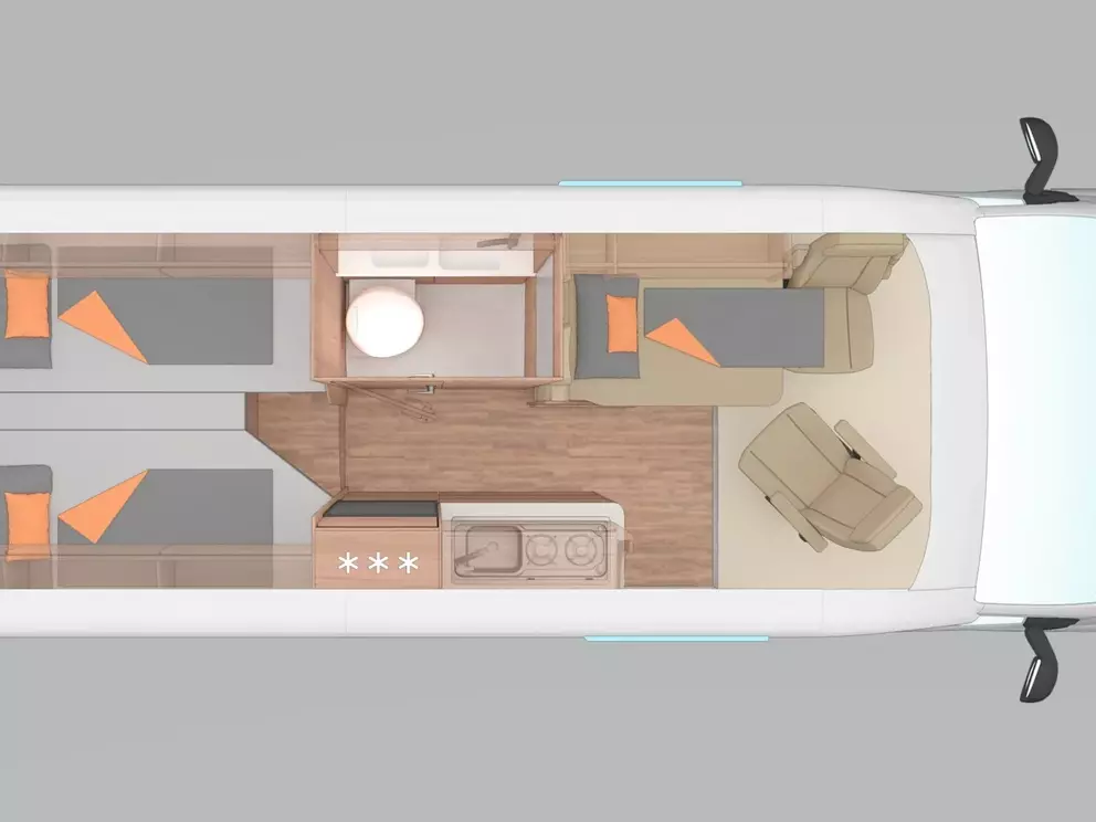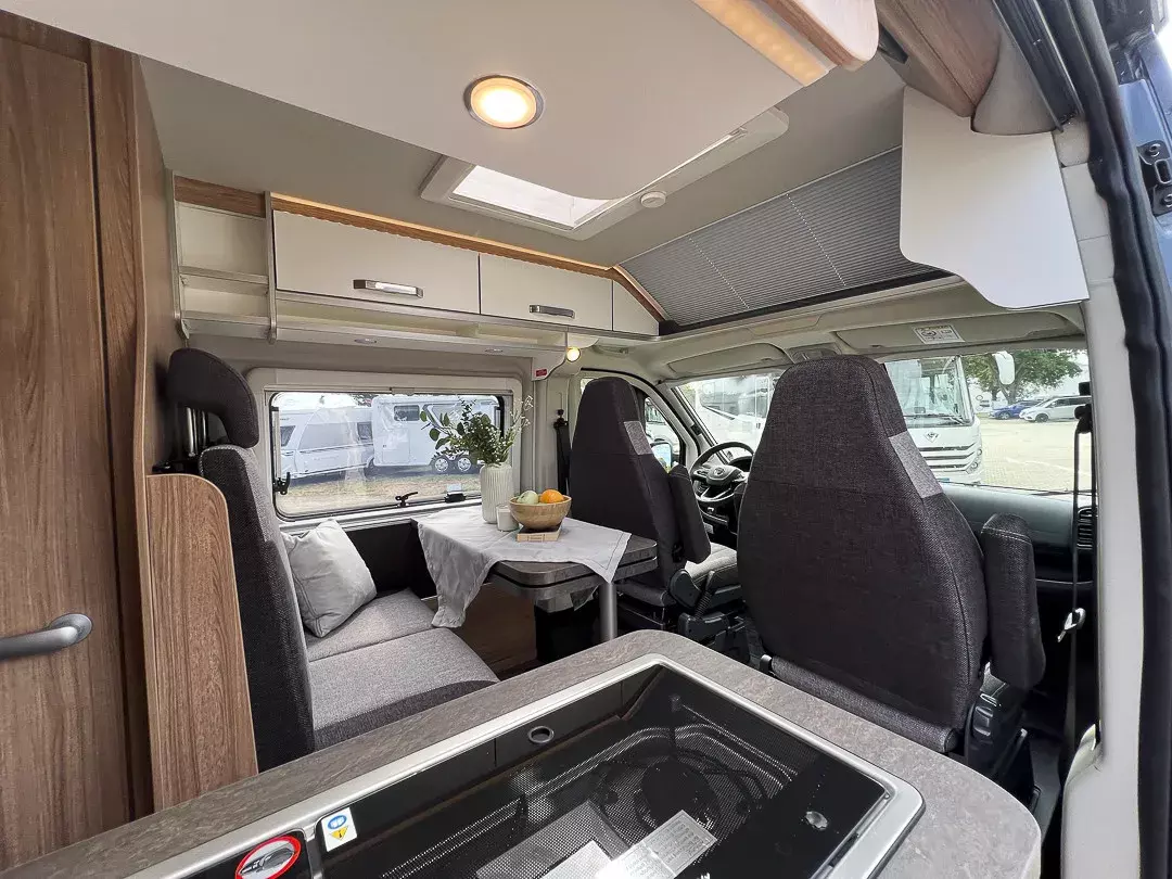 - Voltage-Paket (Regenrinne über der Schiebetür mit LED (dimmbar), 230 V SCHUKO-Steckdose zusätzlich, in der Sitzgruppe (1 Stück), 230 V SCHUKO-Steckdose zusätzlich, im Heck (1 Stück), USB-Steckdose (1 Stück), im Küchenbereich, USB-Steckdose (1 Stück), im Heck, Leseleuchten im Fahrerhaus, Ambientebeleuchtung im Wohnraum/Nasszelle (dimmbar))