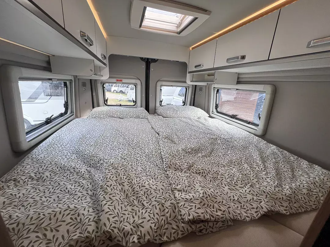 * Der Innenraum präsentiert sich im Polster „Active Rock“, mit Seitensitzgruppe, vielen Stauraumlösungen und Dieselheizung für ganzjährige Nutzung. Panoramafenster, Rahmenfenster, Verdunkelungen und die TRUMA iNet X Steuerung bringen viel Komfort. Durch Betterweiterung lässt sich im Heck eine große Liegewiese schaffen.