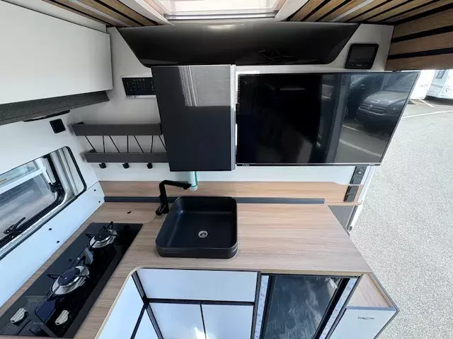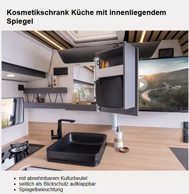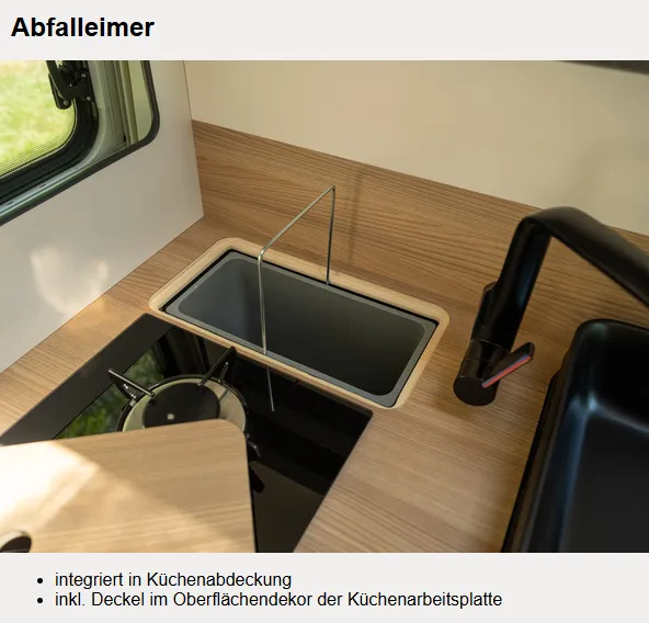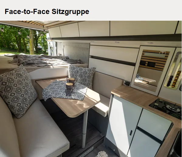 - Voltage-Paket CaraLife: Regenrinne über der Schiebetür mit LED (dimmbar) / 230 V SCHUKO-Steckdose zusätzlich, (Küche, 1 Stück) / 12 V Powersteckdose zusätzlich, im Heck (1 Stück) / USB-Steckdose (1 Stück), in der Sitzgruppe + (1 Stück), im Küchenbereich / Stimmungsvolle Ambientebeleuchtung (dimmbar)