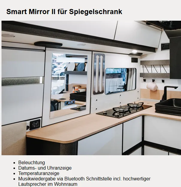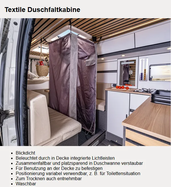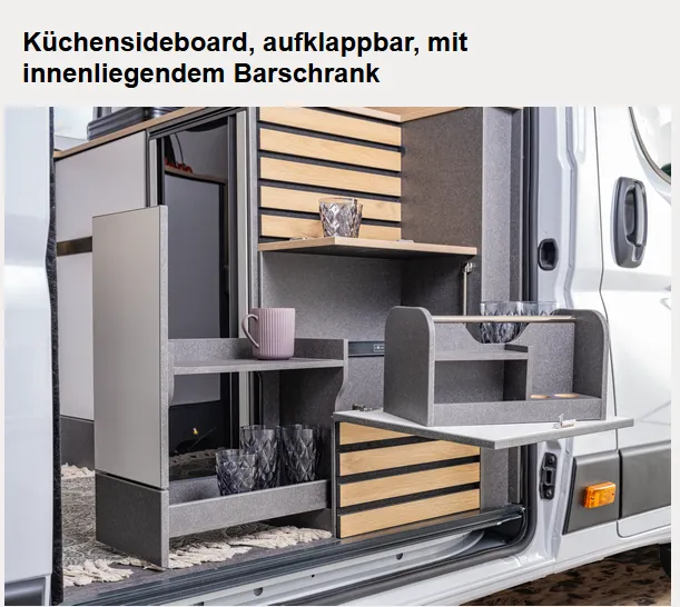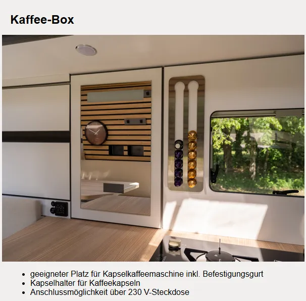 - Voltage-Paket CaraLife: Regenrinne über der Schiebetür mit LED (dimmbar) / 230 V SCHUKO-Steckdose zusätzlich, (Küche, 1 Stück) / 12 V Powersteckdose zusätzlich, im Heck (1 Stück) / USB-Steckdose (1 Stück), in der Sitzgruppe + (1 Stück), im Küchenbereich / Stimmungsvolle Ambientebeleuchtung (dimmbar)