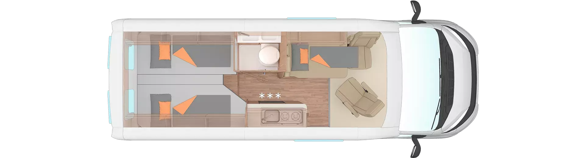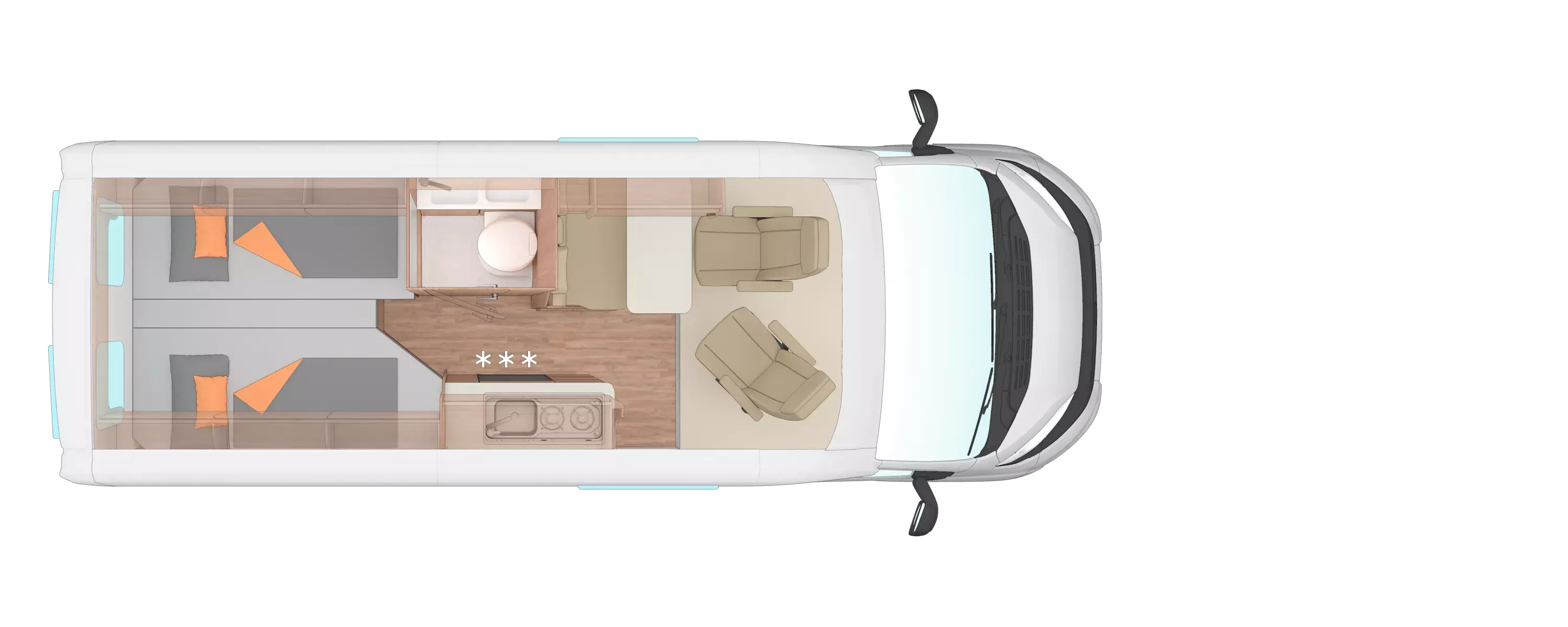 | Betten | Einzelbett, Doppelbett längs, Aufstelldach (Doppelbett) |