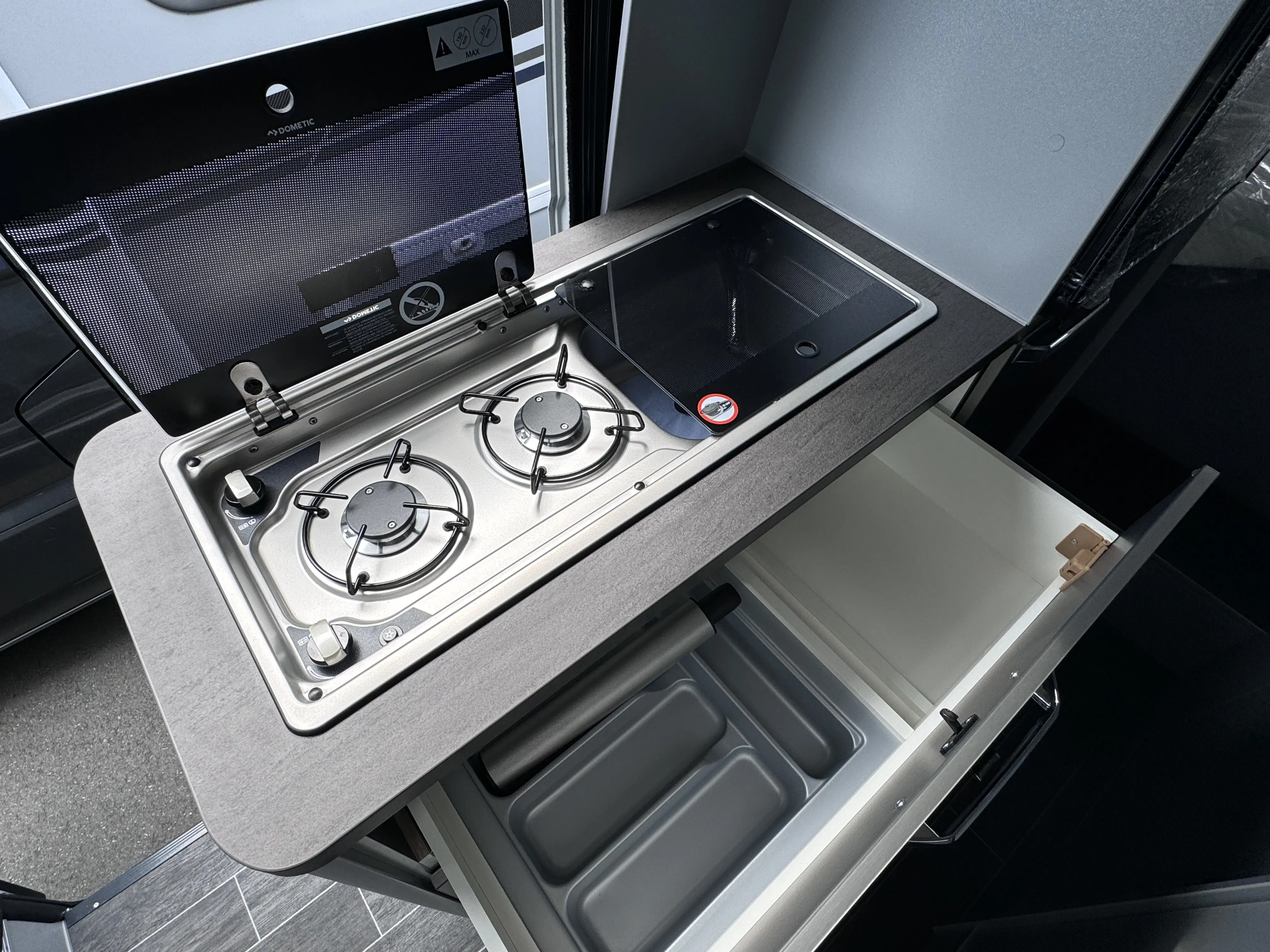- Kocher-Spülen-Kombination inkl. 2-Flammen-Kocher mit elektrischer Brennerzündung und geteilter Glasabdeckun