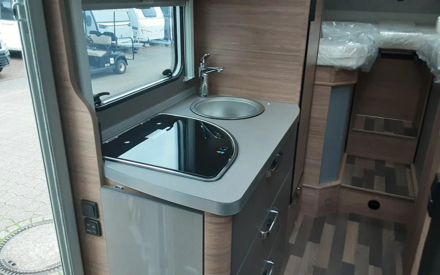 - Markise 405 x 250 cm weiß, Media-Center 6,8", Leichtmetallfelgen für Serienbereifung, Front- und Seitenscheibenverdunklung, Rückfahrkamera inkl. Verkabelung, Ausstellfenster Hutze mit Insektenschutz und Verdunklung (Bug),