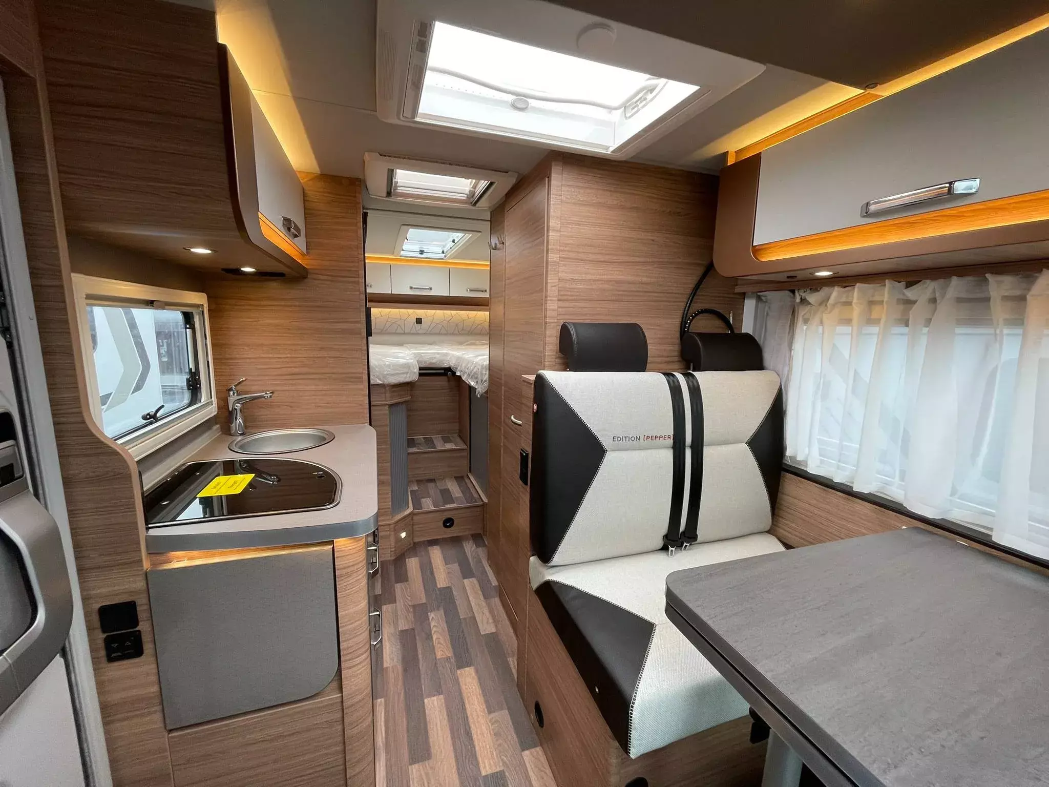 Garagentür 80 x 110 cm links, Dachhaube (He-Ki) 70x50cm (Bug), Ausstellfenster Hutze mit Insektenschutz, Sonderbeklebung EDITION [PEPPER], Nebelscheinwerfer mit Abbiegelicht, Frontstossfänger in Wagenfarbe lackiert, Hochwertige Passform-Sitzbezüge, Kraftstofftank 90 Liter, Chassis Uni-Lackierung: Weiss, Spoilerlippen (skid-plate), Rückfahrkamera inkl. Verkabelung, USB-Steckdose (1) im Heck, Vorverkabelung für TV (Schlafbereich), Media-Center 6.8", Vorverkabelung für TV (Wohnbereich), Isolierhaube Abwassertank beheizbar, Markise 405 x 250 cm weiss, Front- und Seitenscheibenverdunklung, Betterweiterung zur Liegewiese, Stimmungsvolle Ambientebeleuchtung, Polster: MALABAR, Anzahl d. zug. Sitzplätze: 4