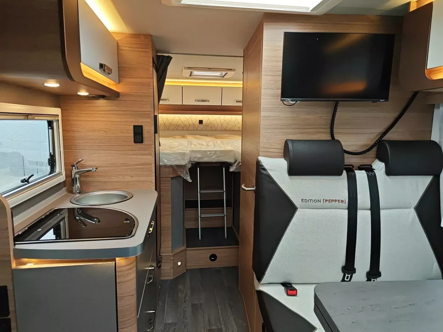 - Stimmungsvolle Ambientebeleuchtung, Armlehnen beidseitig an Fahrer- und Beifahrersitz, Isolierhaube Abwassertank, beheizbar, Lederlenkrad und Lederschalthebe, TÜV und Zulassungspapier, 230 V SCHUKO-Steckdose, zusätzlich (Garage), Vorverkabelung für TV (Wohnbereich), Vorverkabelung für TV (Schlafbereich), USB-Steckdose (1 Stück), im Heck, ?Ganzjahresbereifung Camper, Höhenverstellung Beifahrersitz, Außenspiegel beheizbar und elektrisch verstellbar, Sonderbeklebung EDITION [PEPPER], Polster: MALABAR