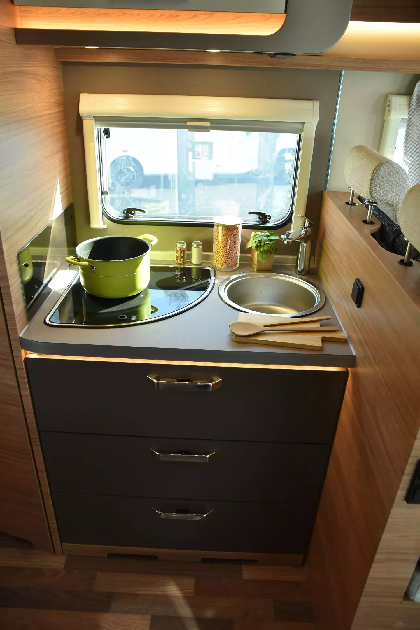* Im Alltag zeigen sich die vielen Komfortdetails der Platinum-Konfiguration: große Fensterflächen, eine breite Aufbautür, harmonische Innenbeleuchtung und die komfortable Einstiegstufe machen jede Reise leicht. Die moderne Mediaeinheit mit Head-Up-Display, Navigationsfunktion und Rückfahrkamera sorgt für entspanntes Fahren, während TRUMA iNet X, Wasserfiltersystem und isolierter Abwassertank echte Vorteile im Campingalltag bieten.