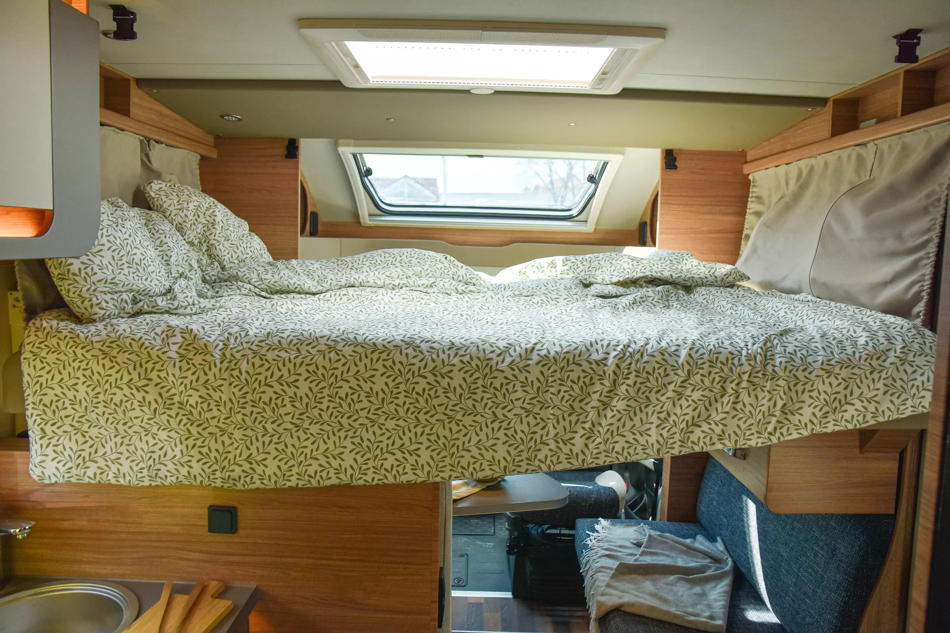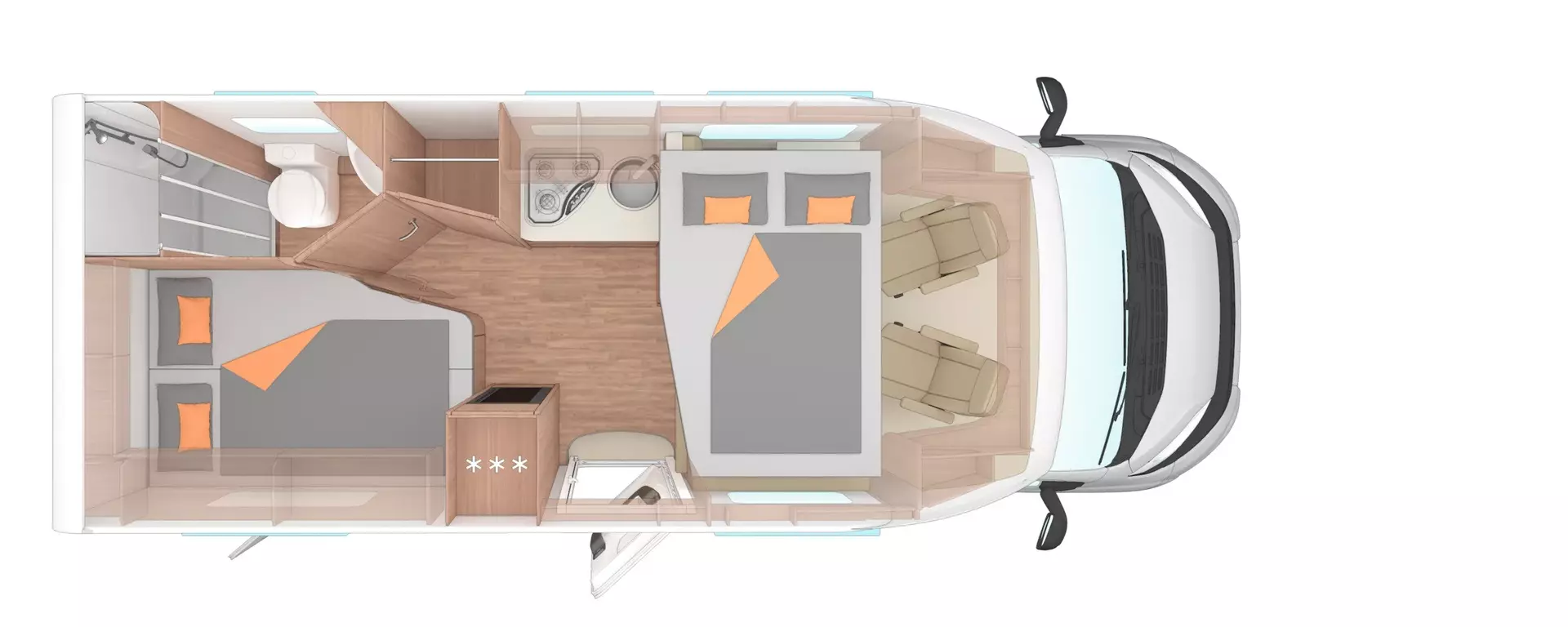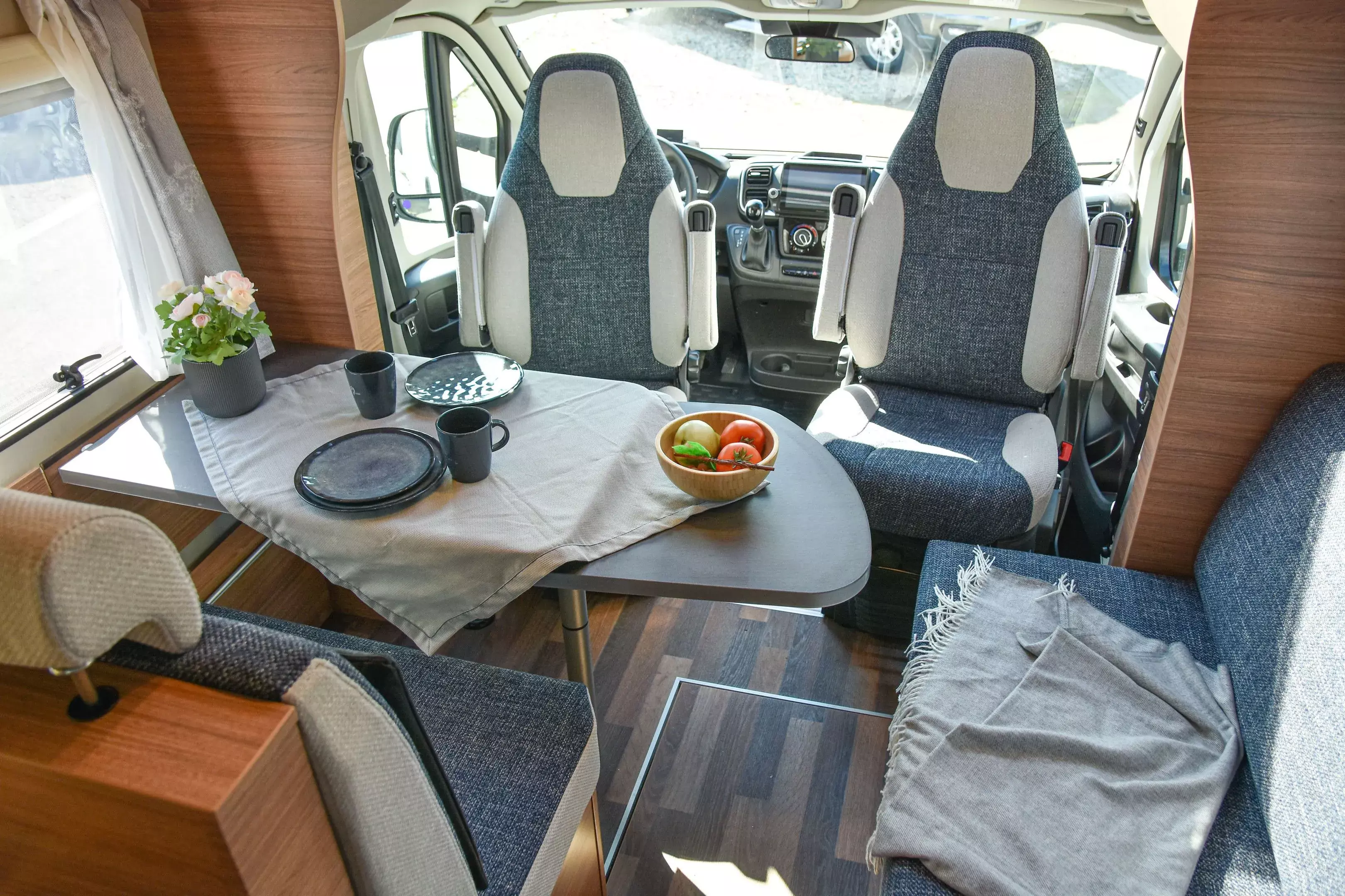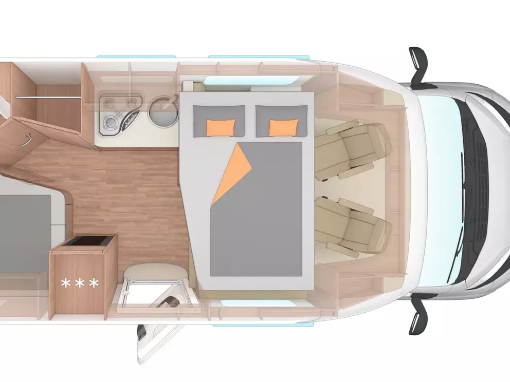 * Auf der Straße überzeugt der 140-PS-Ducato mit der 8-Stufen-Automatik durch ein ruhiges, entspanntes Fahrgefühl. Die Voll-LED-Frontbeleuchtung, der lackierte Stoßfänger und die Leichtmetallfelgen geben dem 650 MF einen modernen, wertigen Auftritt. Dank der guten Isolierung, dem stabilen Aufbau und der elektrisch steuerbaren Parkbremse fühlt sich das Fahrzeug auch bei wechselndem Wetter sicher und angenehm an.