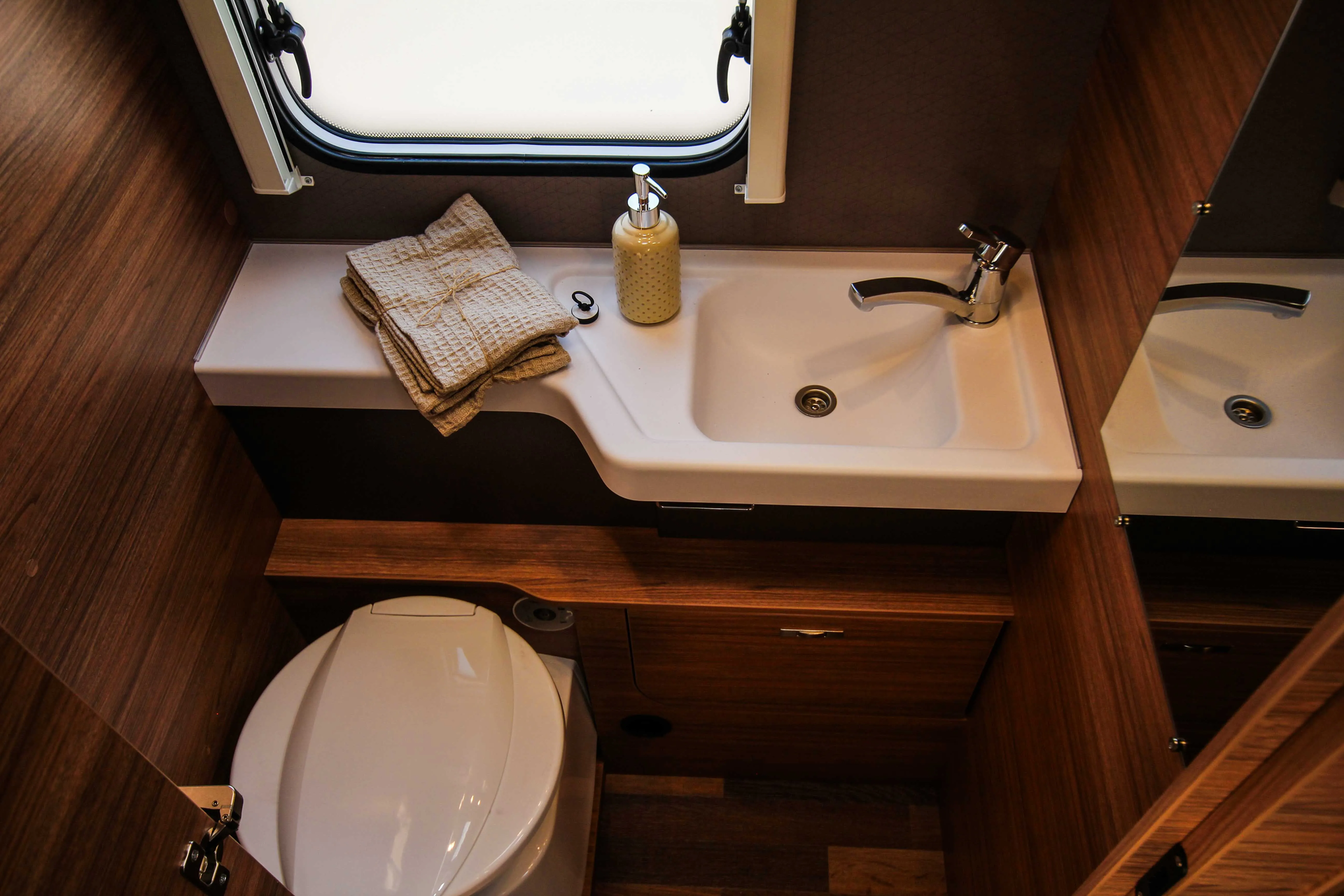 - Ausstellfenster 52 x 50 cm, mit Insektenschutz und Verdunklung (Toilettenraum)