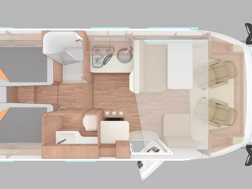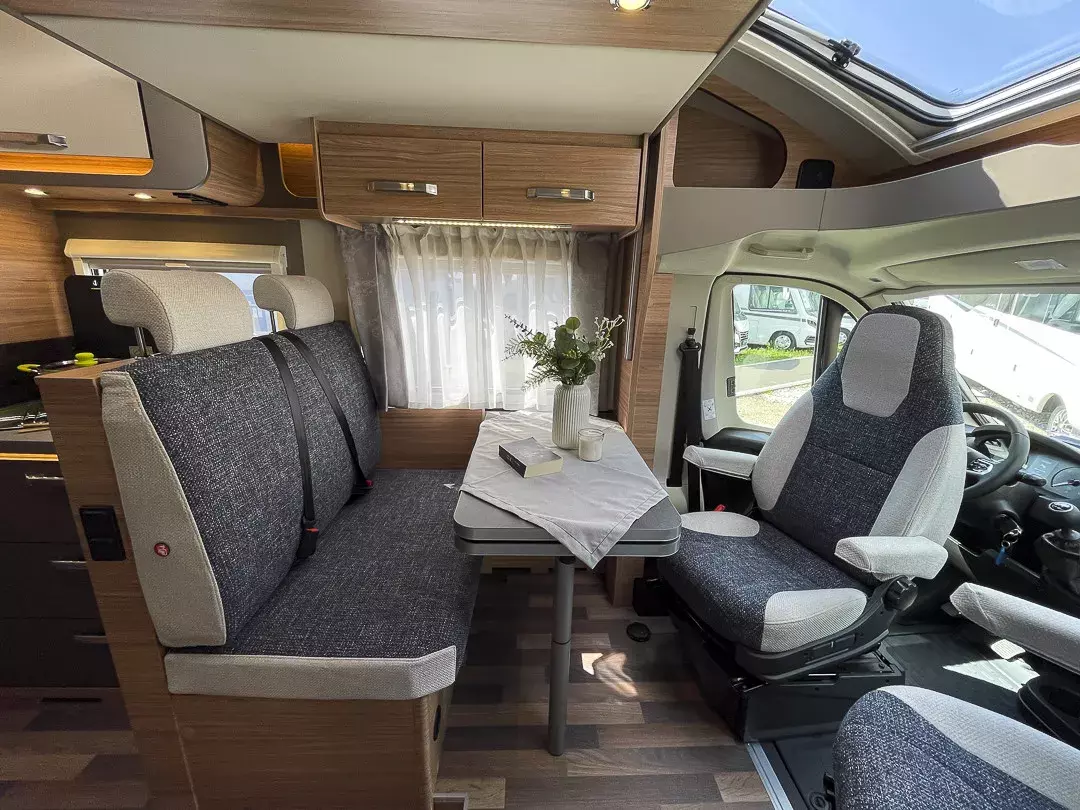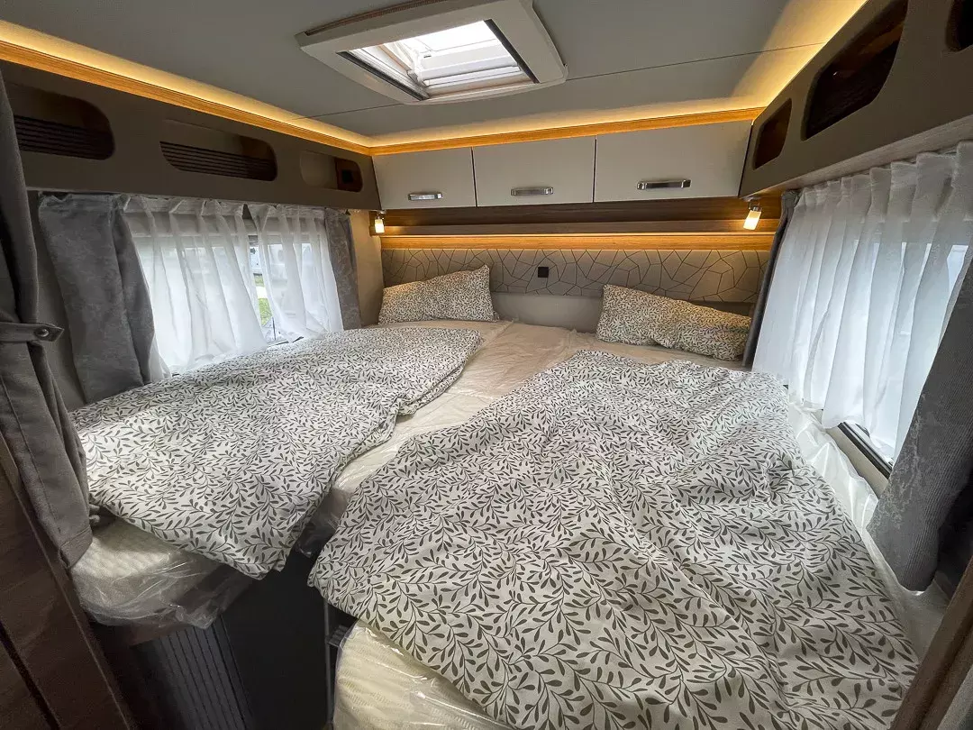 Der CaraSuite 700 ME überzeugt als vielseitiges Wohnmobil mit vier Schlafplätzen und fünf zugelassenen Sitzplätzen – ideal für Familien oder kleine Gruppen, die Wert auf Flexibilität und Komfort legen. Die bequemen Einzelbetten, die großzügige Seitensitzgruppe und die Polsterung „Dusk“ schaffen ein wohnliches Ambiente für entspannte Reisen.