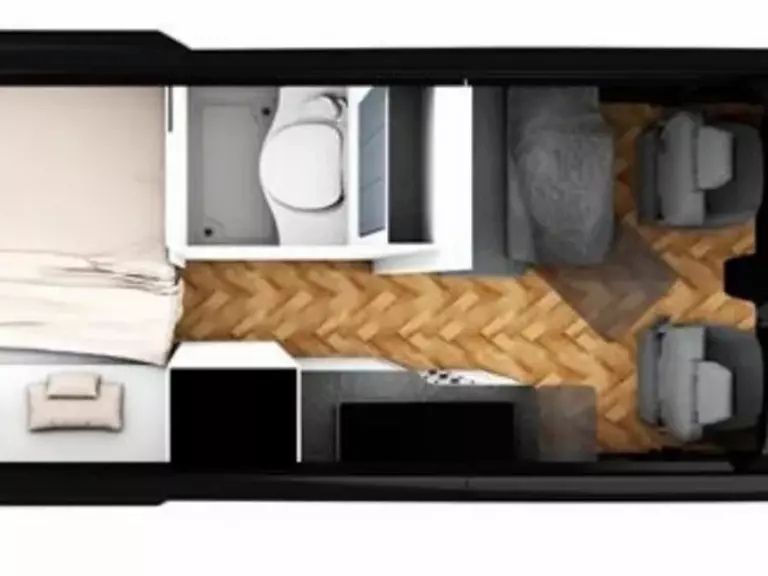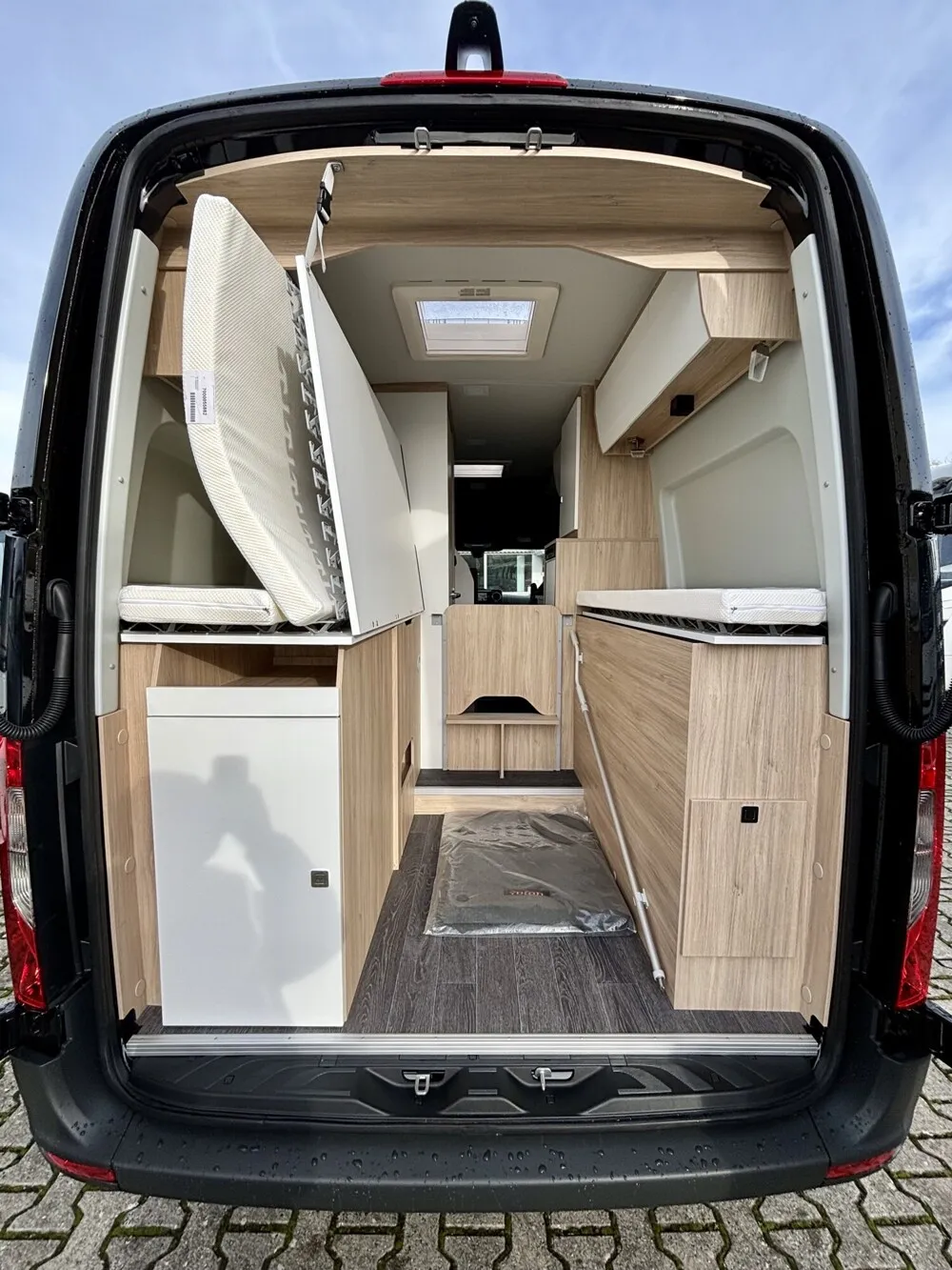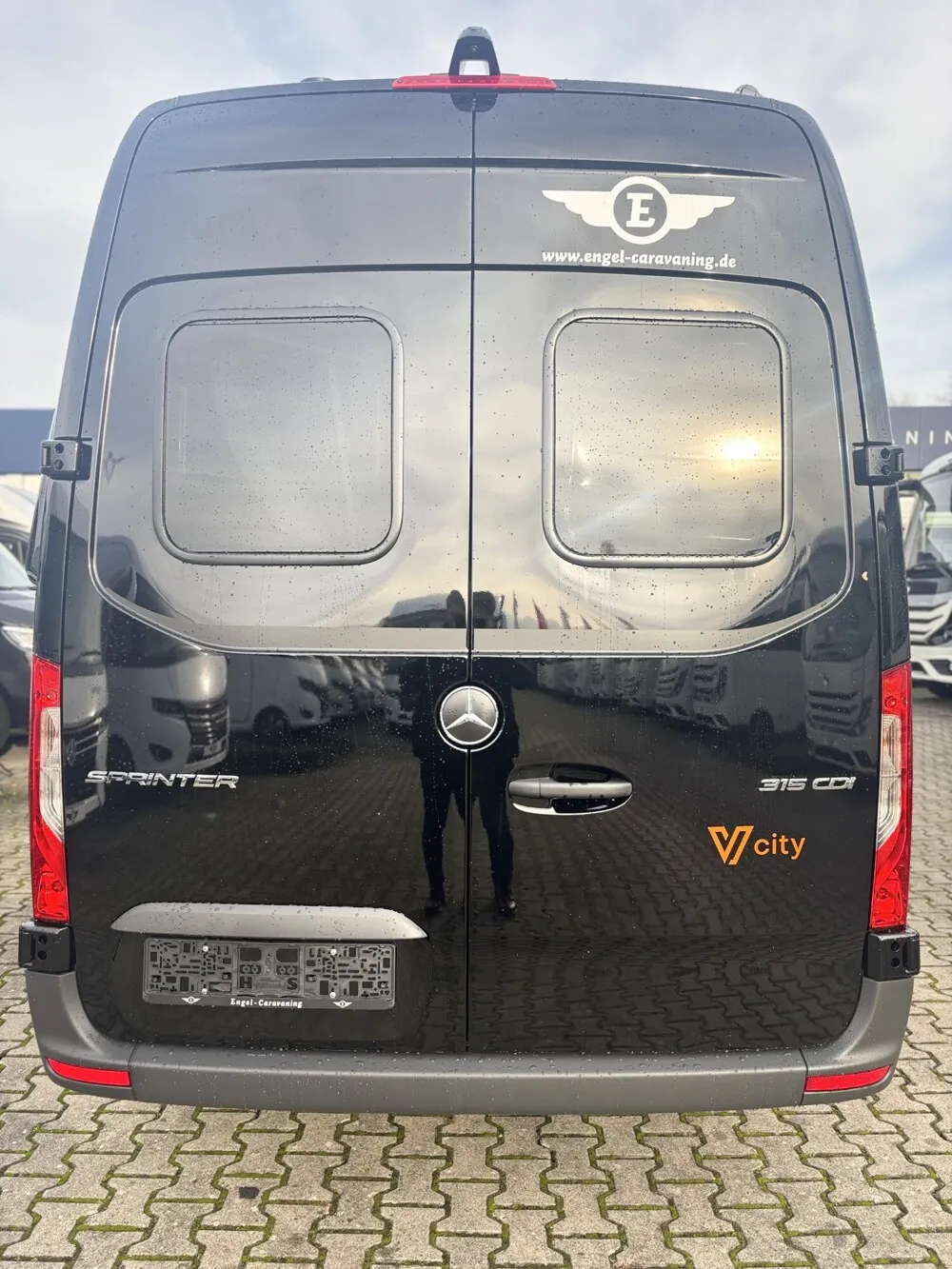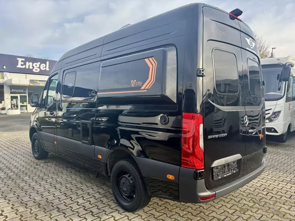 - V-City Ausstattung (V-City Außendekor, V-City Wohnwelt, Batterie Booster, Außenfarbe Tiefschwarz, Steckdosenpaket Yucon, Magnet-Verdunklung für Fahrerhaus, Truma Combi 4, Yucon Schlafkomfort deluxe (Stärkere Matratze und Tellerfedersystem statt Abstandsgewirk unter Matratze)
