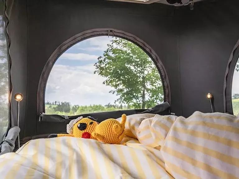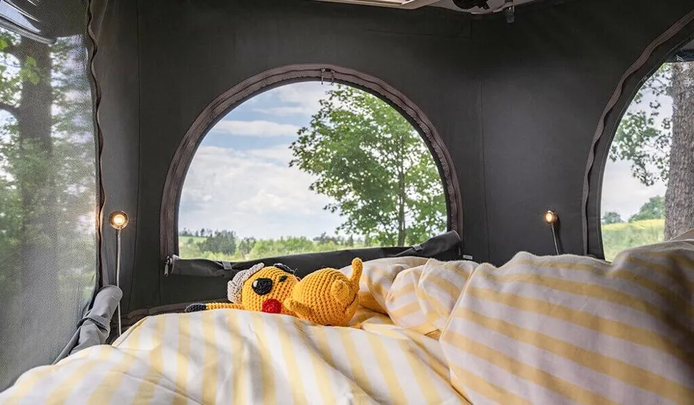 - Aufstelldach mit (einem zusätzlichen 90 W Solarpanel (somit insgesamt 2x 90 W) auf dem Aufstelldach montiert und inklusive Mini-Heki für Aufstelldach. Mit zusätzlichem Fenster in Waschraum. Bei 6.0: Serienmäßige Dachluken entfallen. Bei 7.0 GD: Vordere serienmäßige Dachluken entfallen, hinteres Mini-Heki über Betten bleibt unverändert. Nur für Yucon Edition)