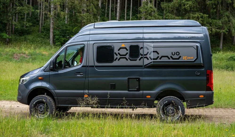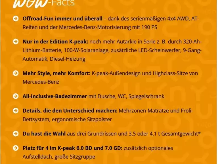 - Yucon Serienausst. K-Peak (Allrad-Edition inklusive:Spezielles Außen- und Innendesign, zusätzliche LED Leuchten an Fahrzeugfront, Batterie Booster, Zusatzladegerät für Starterbatterie, Wäscheleine, Steckdosenpaket, Heizung Abwassertank inklusive elektromagnetischem Ventil zur Entleerung, Vorzeltleuchte, Midi Heki (außer bei Aufstelldach), Fahrerhaus-Teppich, 100 W Solaranlage, Schlafkomfort deluxe, 320 Ah LiFePO Batterie, DieselheizungBei allen GD inkl. GD-Bettverlängerung Bei 6.0 GD: Inkl. Stauraumpaket)