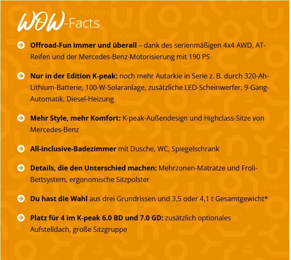 - Yucon Serienausst. K-Peak (Allrad-Edition inklusive:Spezielles Außen- und Innendesign, zusätzliche LED Leuchten an Fahrzeugfront, Batterie Booster, Zusatzladegerät für Starterbatterie, Wäscheleine, Steckdosenpaket, Heizung Abwassertank inklusive elektromagnetischem Ventil zur Entleerung, Vorzeltleuchte, Midi Heki (außer bei Aufstelldach), Fahrerhaus-Teppich, 100 W Solaranlage, Schlafkomfort deluxe, 320 Ah LiFePO Batterie, DieselheizungBei allen GD inkl. GD-Bettverlängerung Bei 6.0 GD: Inkl. Stauraumpaket)