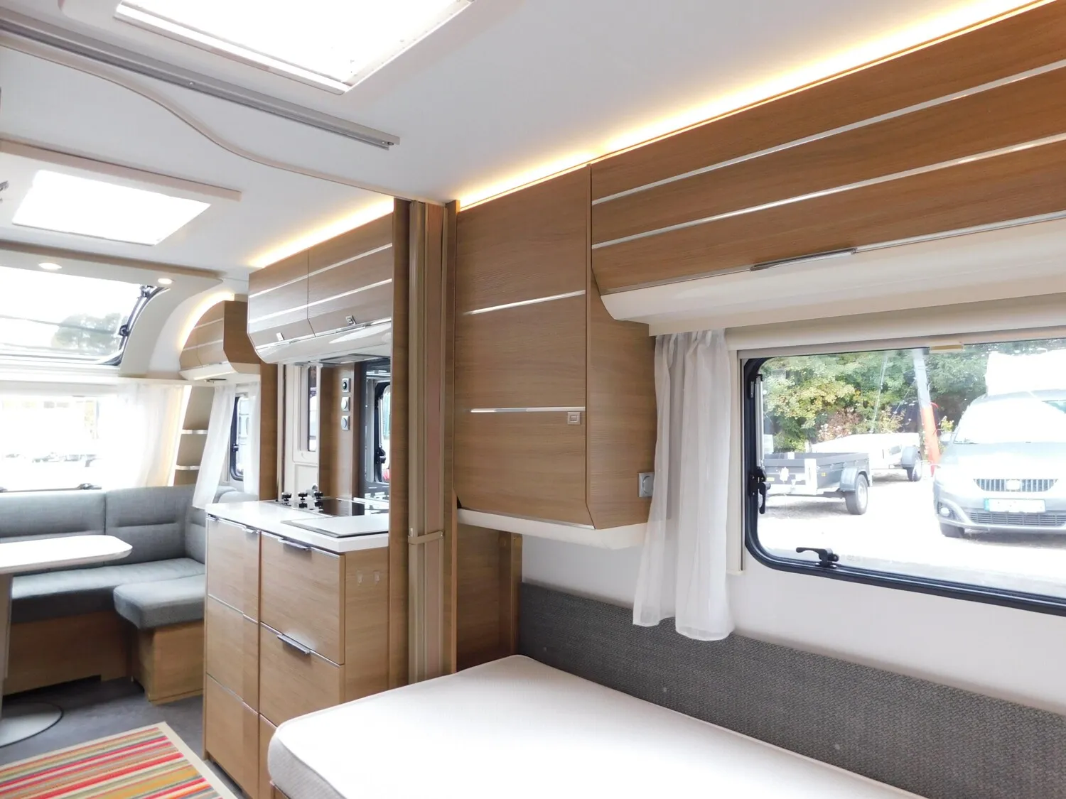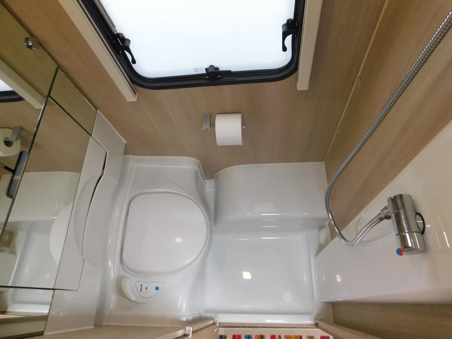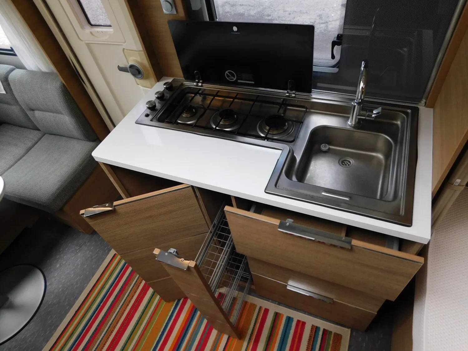 - Paket COMFORT (TFT-Halterung Schlafbereich mit Deckenschiene, Einsäulen-Tischfuß, Spülenabdeckung, Abtropfschale, Fliegenschutz an Eingangstür, Panorama-Dachhaube Bug)