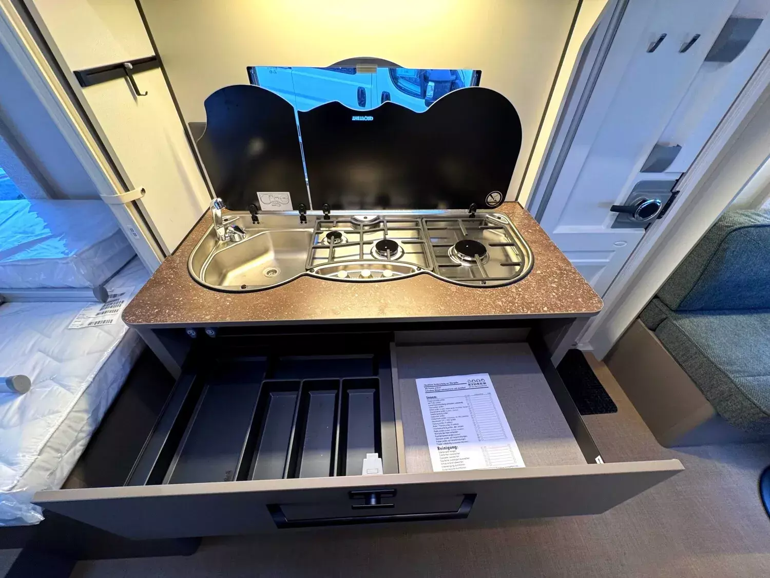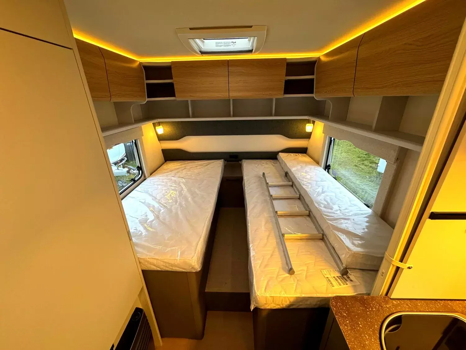 - Ausstattungshighlights B66 Wohnwagen: Antischlingerkupplung AKS 3004, Sicherheitsfahrwerk, Fliegenschutz für Eingangstür, GFK Unterboden, GFK-Bugwand und -Dach mit reduzierter Hagelempfindlichkeit, Sitzgruppe zur Liegefläche umbaubar, Kompressorkühlschrank, 131,5 L (davon 15 L Gefrierfach), Spüle, 3-flammiger Gaskocher mit E-Zündung und Glasabdeckung, Doppelfenster, getönt und ausstellbar, mit Kombirollos, Home Light inkl. Lade- und Dockingstation (2 Stück), 40 Liter Frischwassertank, Truma Therme Warmwasser u.v.m.