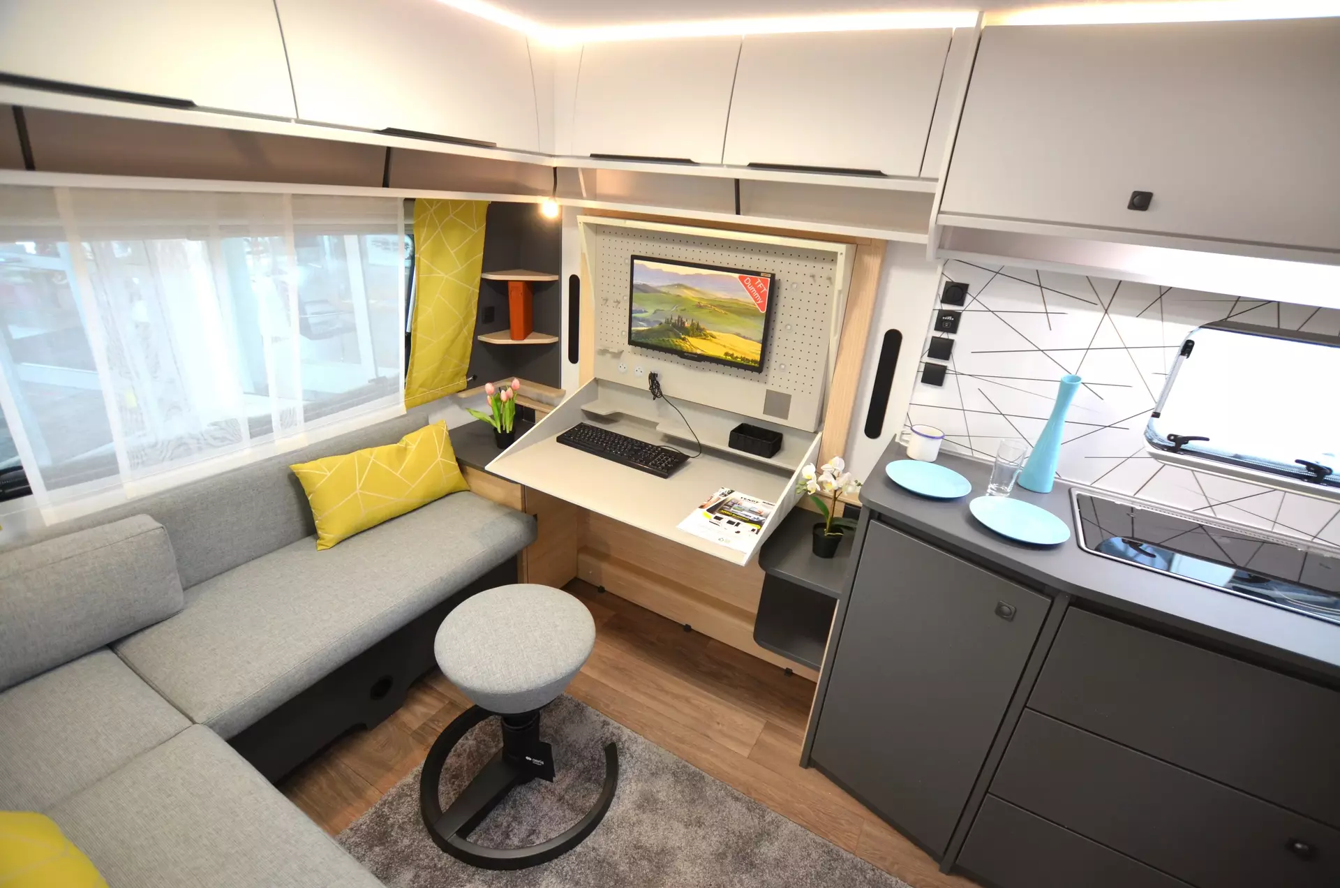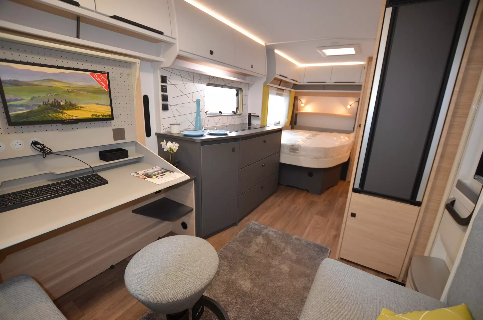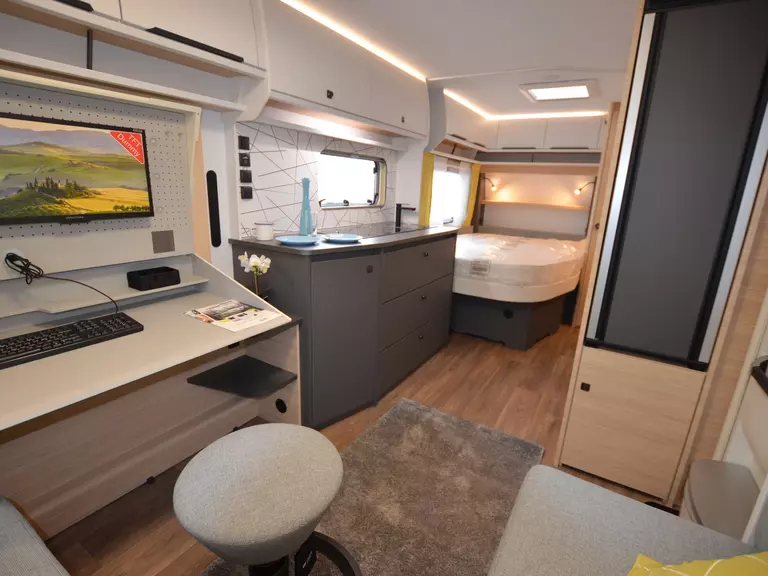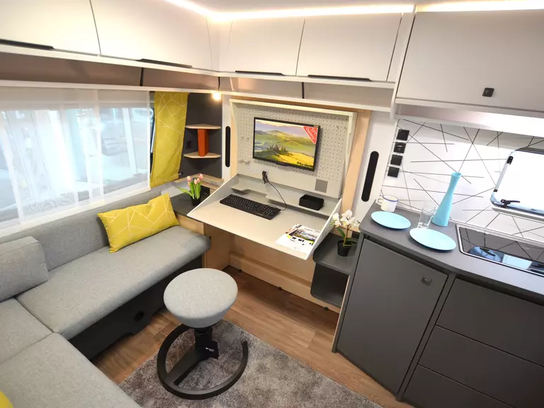 Ein hochwertiger Wohnwagen mit Büroeinrichtung (Schreibtisch etc.)