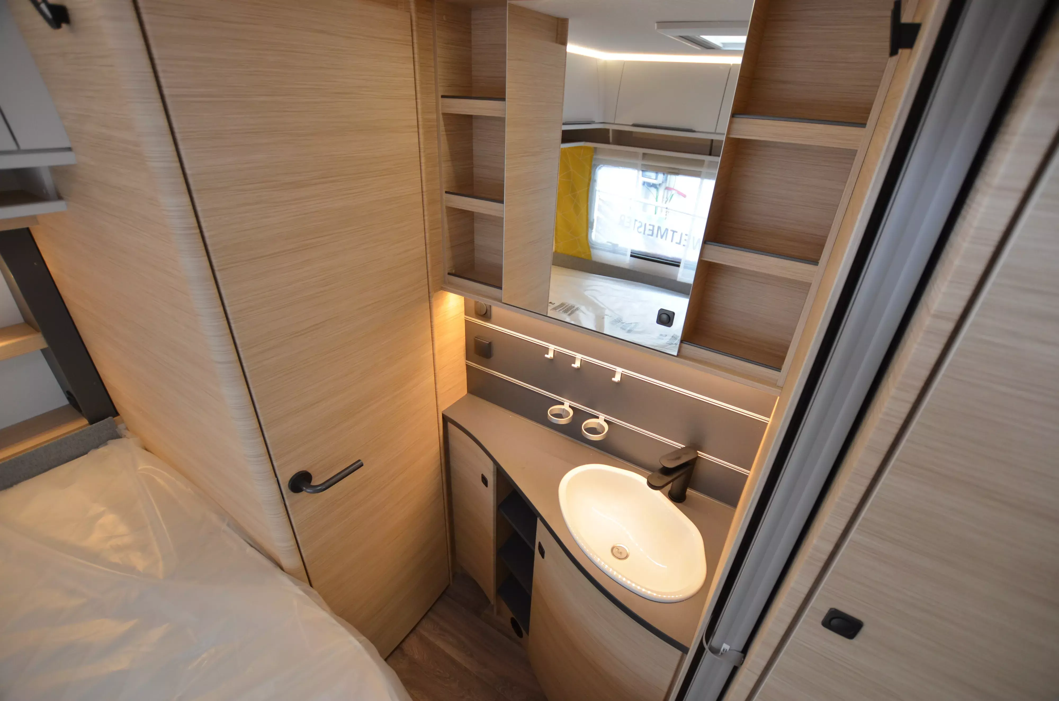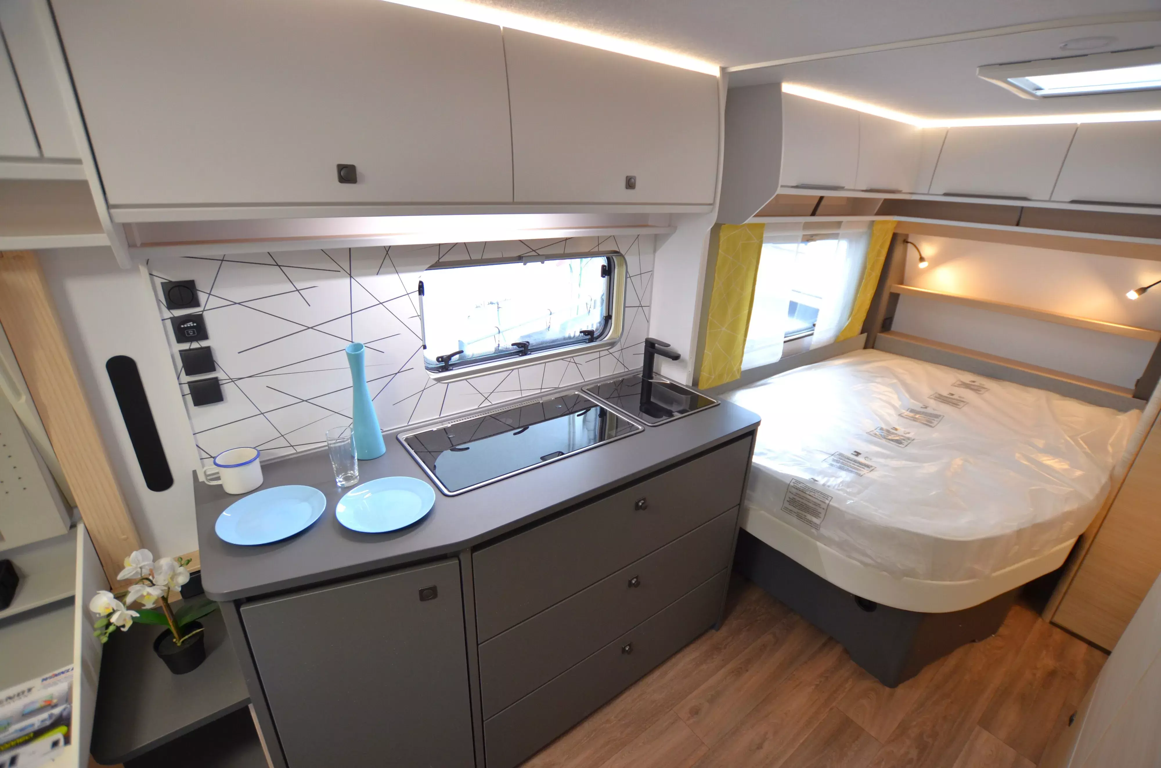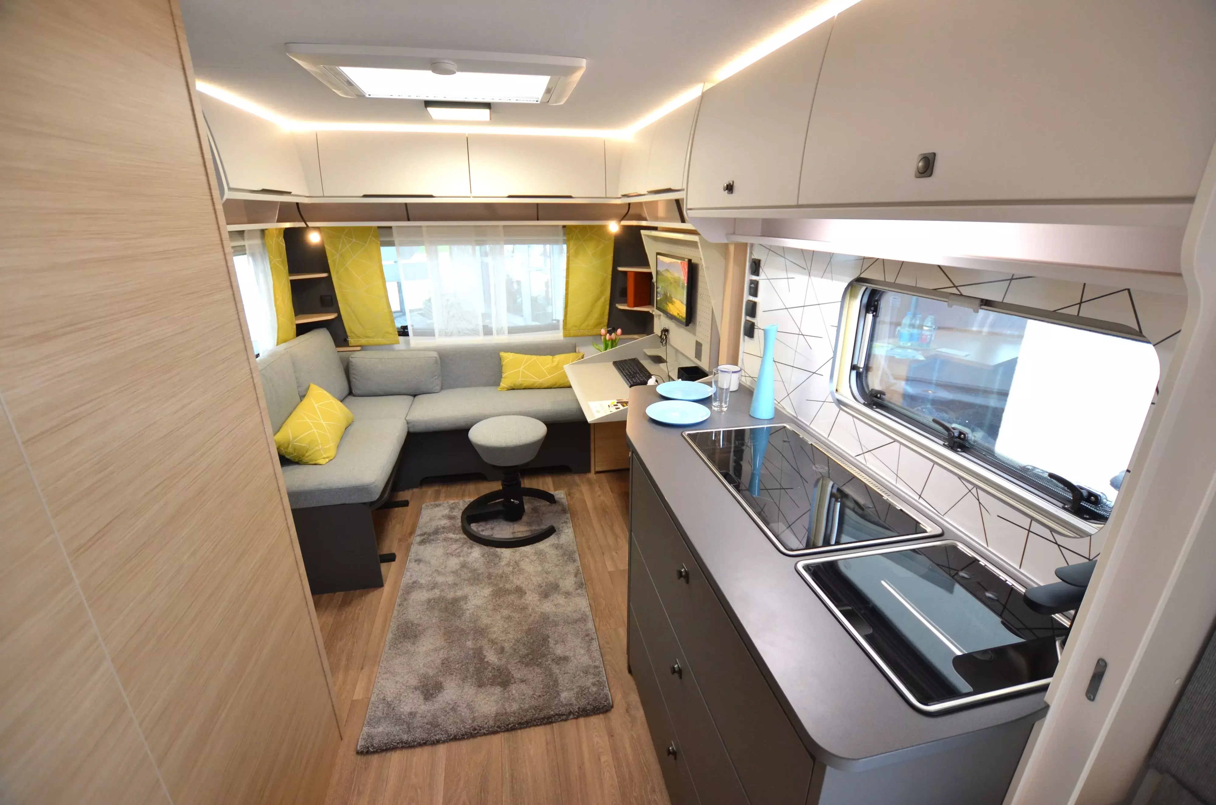 Ein hochwertiger Wohnwagen mit Büroeinrichtung (Schreibtisch etc.)