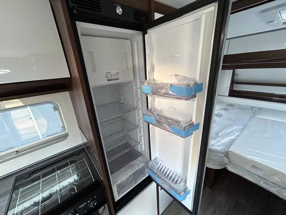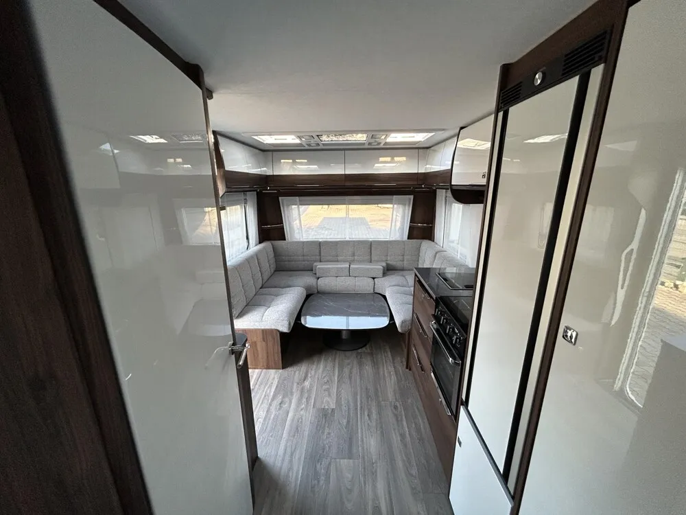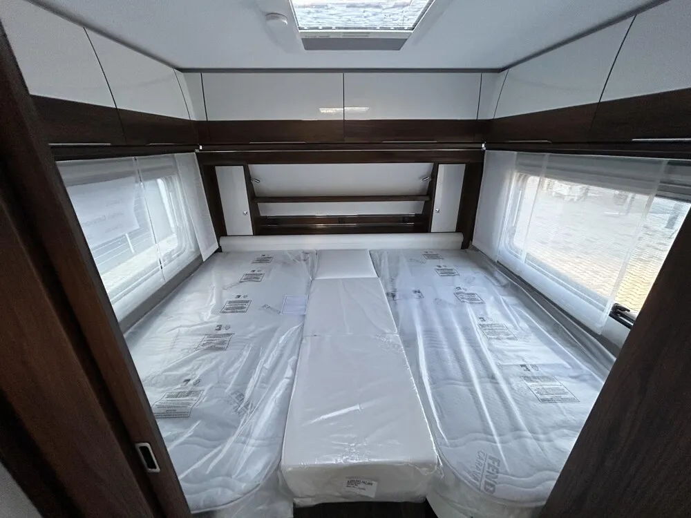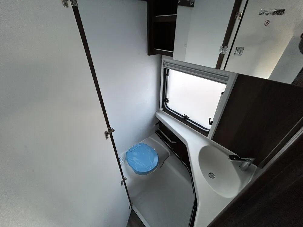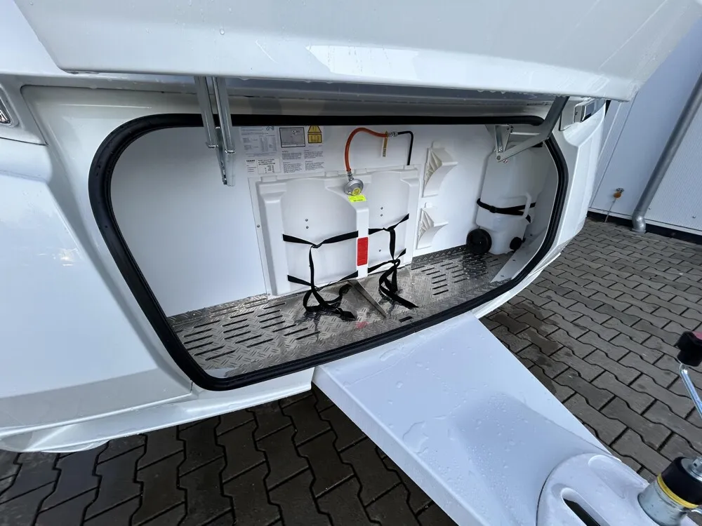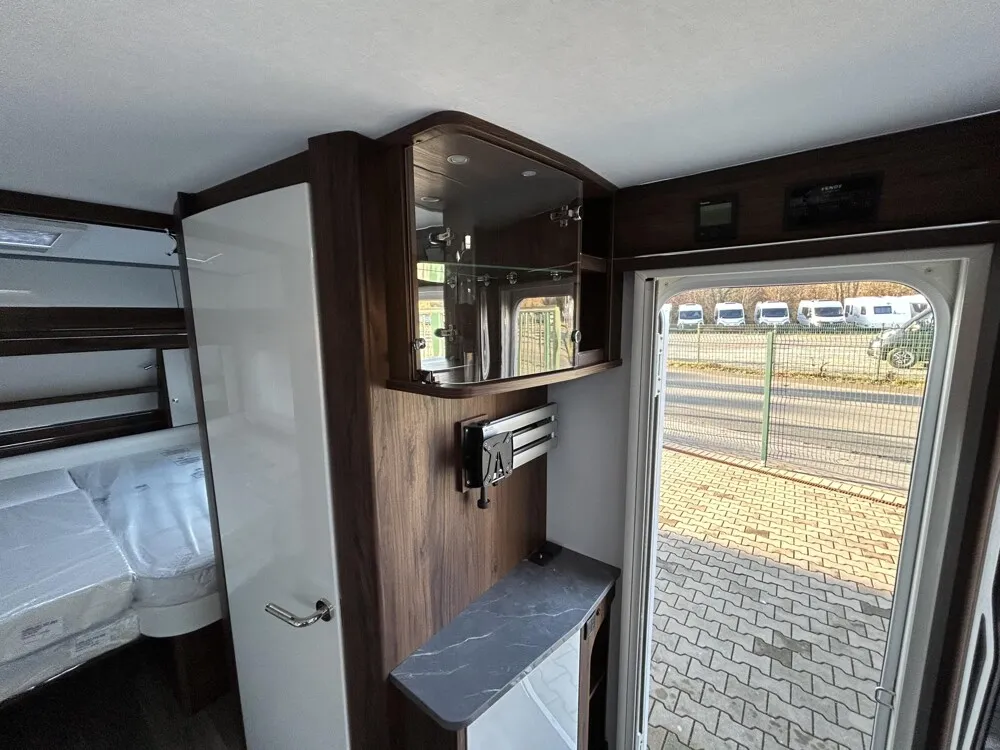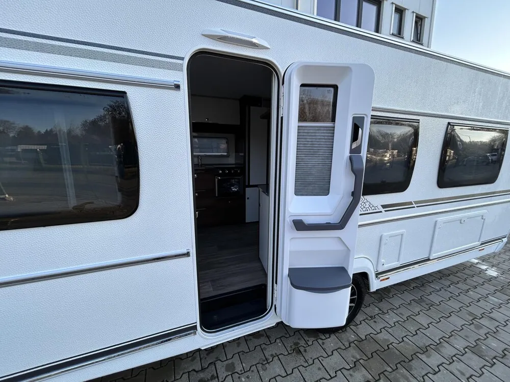 - Eingangstür mit integriertem und isoliertem Einstieg, Abfallsammler und Ablage, im oberen Eingangstürbereich getöntes Fenster und Verdunkelungsplissee
