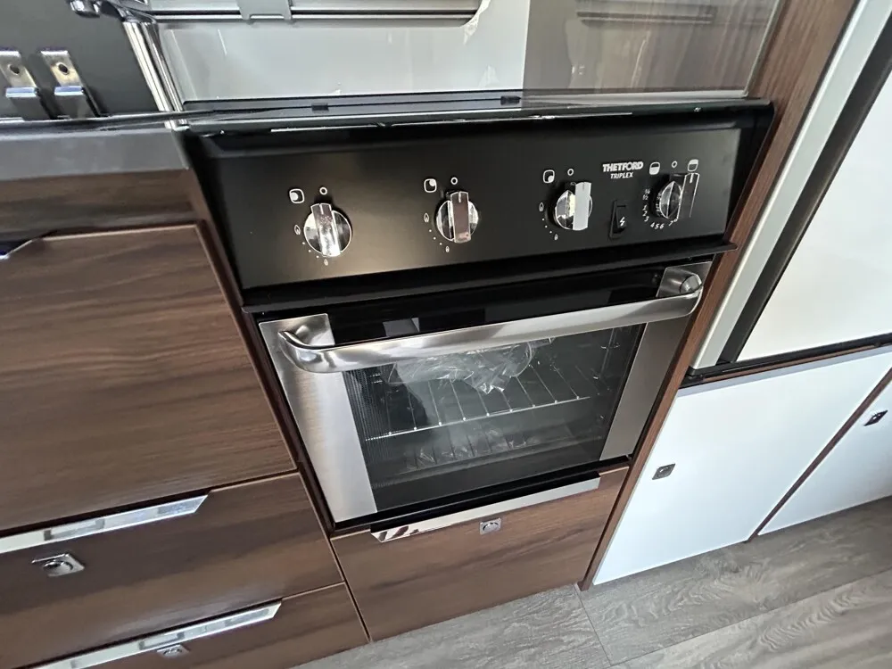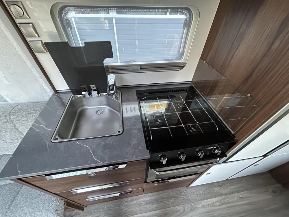 - Kocher (3-flammig) mit Zündsicherung, Zündautomatik, matt emailliertem Kocherrost, Glasabdeckung und separater Spüle mit Glasabdeckung