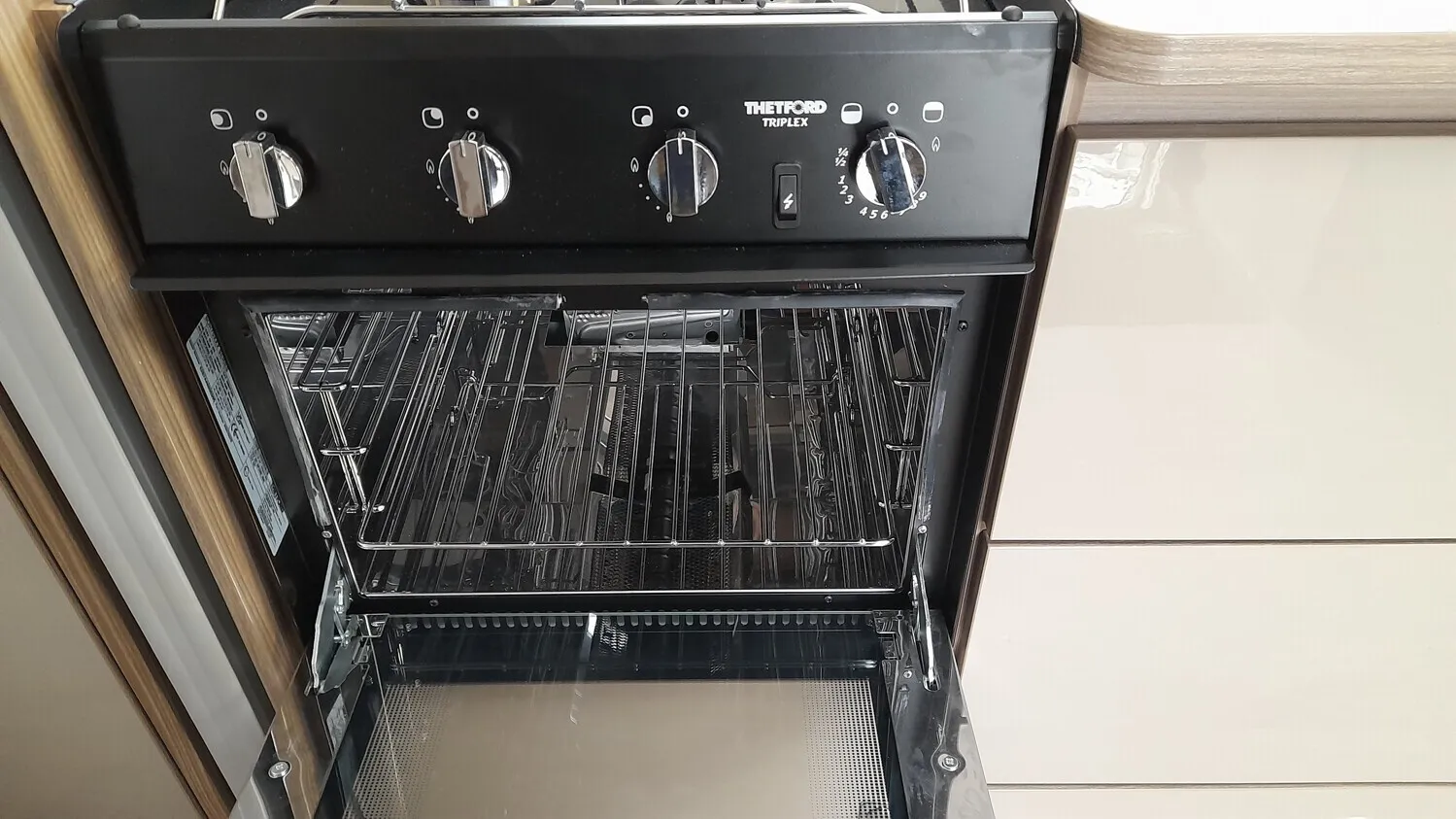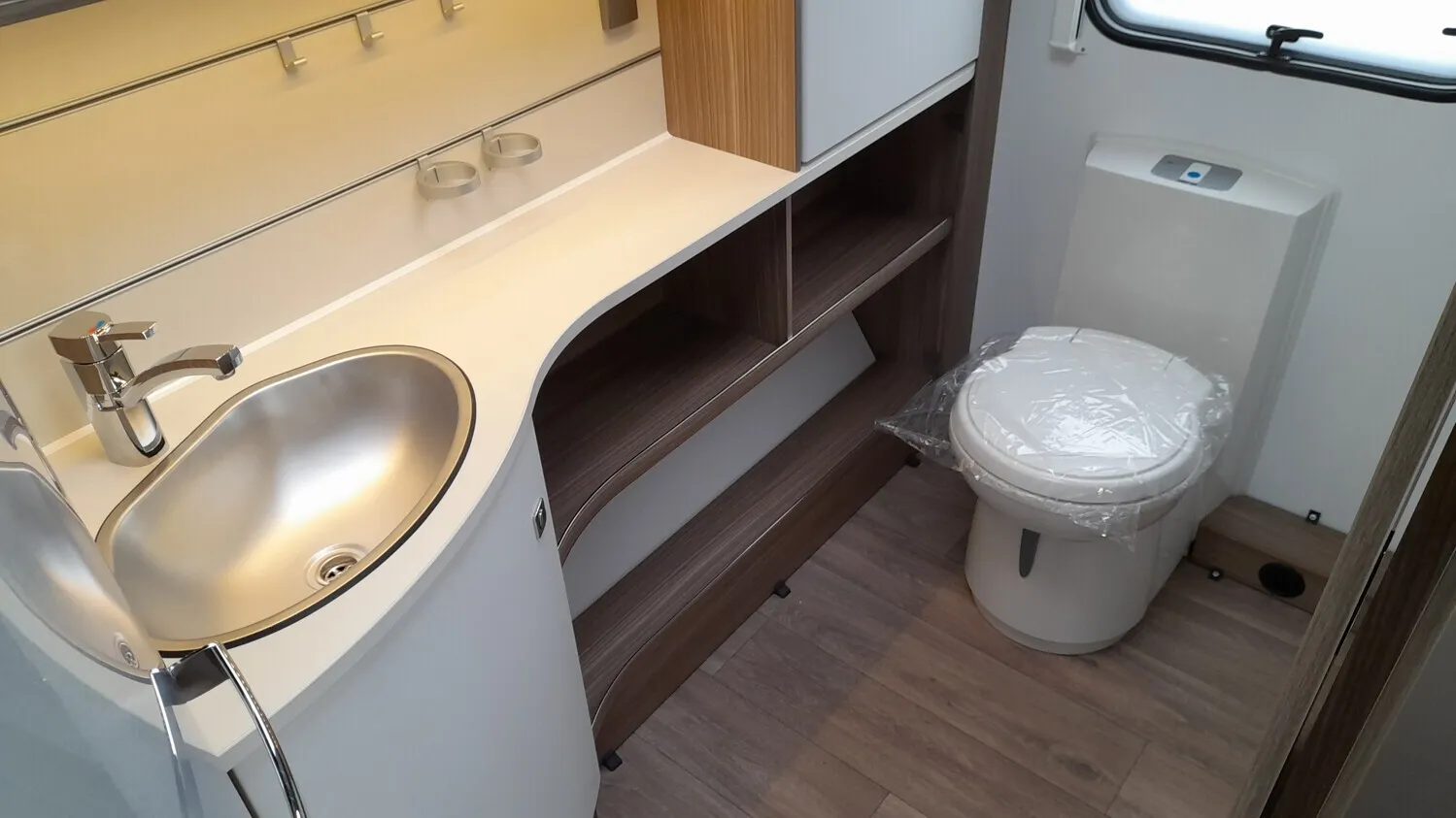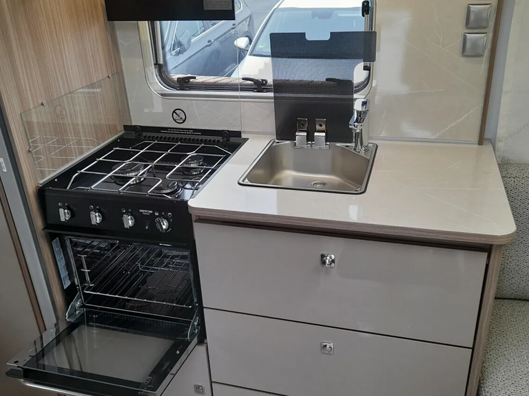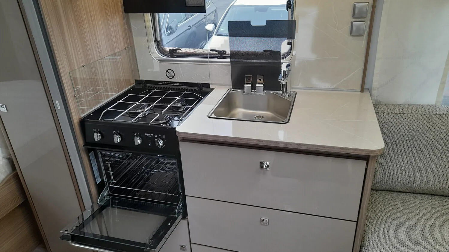 Queensbett (190x150) beidseitig begehbar im hinteren Bereich, große, gemütliche Rundsitzgruppe im Bug. Längsküche mit großen Staumöglichkeiten, Spüle und neu angeordnetem Gaskocher, sowie Gasbackofen. Großes Heckbad über die gesamte Fahrzeugbreite mit separater Dusche, sowie die Thetford-Cassetten Toilette.