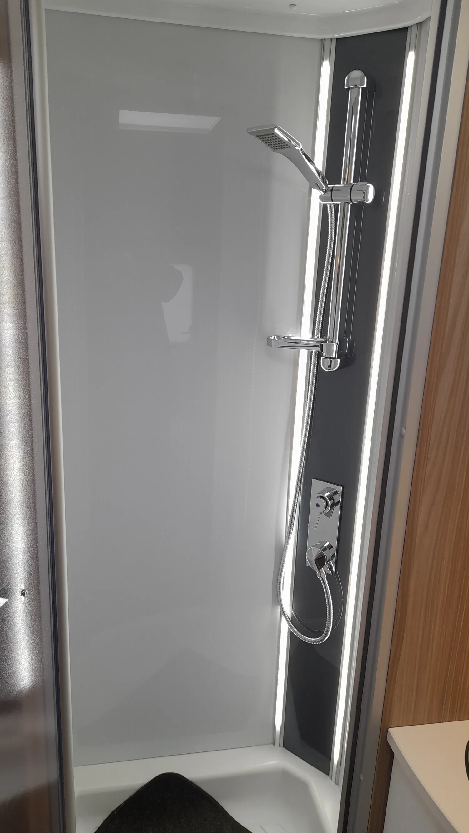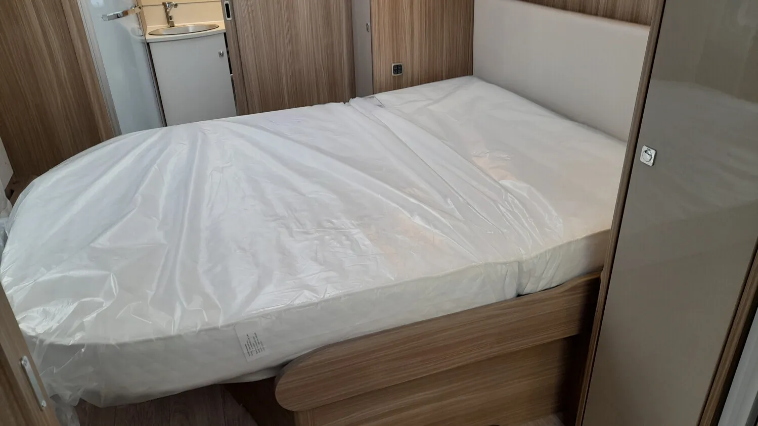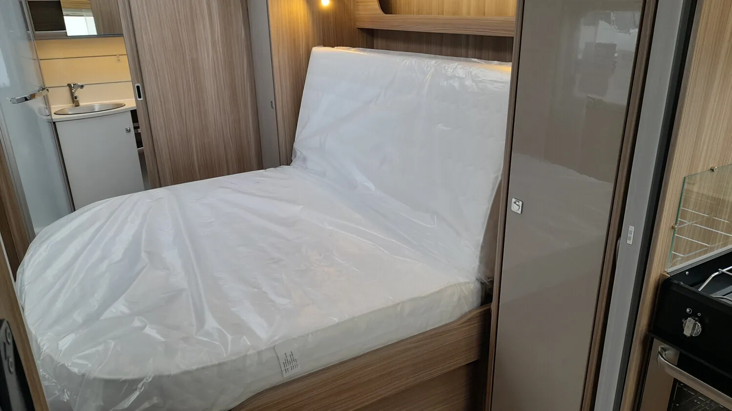 Highlight dieses Fendt-Caravan ist das Queensbett quer im hinteren Bereich mit 190 x 150 cm, sowie das große Heckbad mit separater Dusche.
