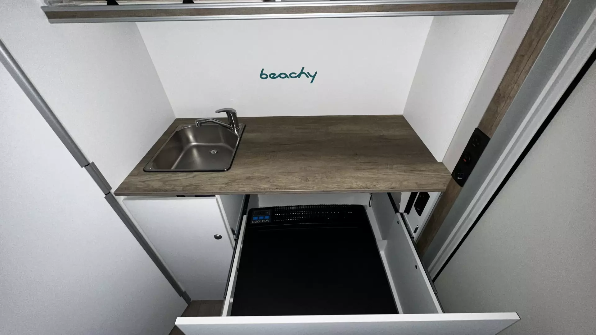 Der Beachy! Er ist kompakt und besticht besonders charmant durch seine runde Form. Ein Highlight ist die große Hecktür: auf dem Bett sitzen und dabei aufs Wasser schauen, das ist echtes Beachyfeeling - egal ob am Strand, in den Bergen oder in der Stadt. In Norddeutschland am Strand geboren ist der BEACHY überall zu Hause.