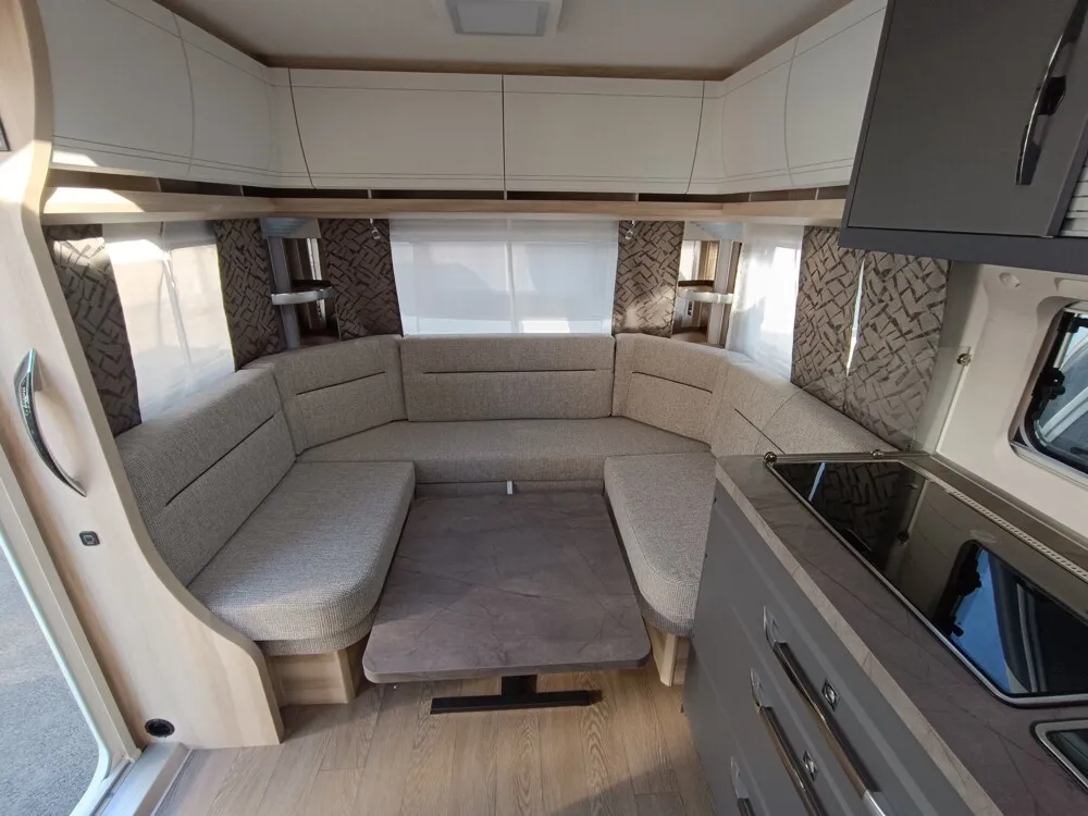 - Winterbelüftung für Sitzgruppe, Stauschränke und Betten, Eingangstür einteilig, extrabreit mit Dreifachverriegelung