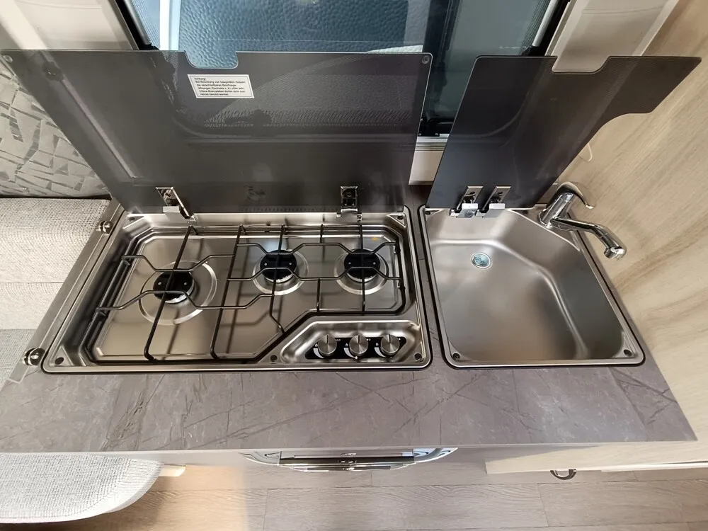 - Absorbertechnik, Kocher und Spüle aus Edelstahl, mit 3-Flammkocher, elektrischer Zündung und zweiteiliger Glasabdeckung