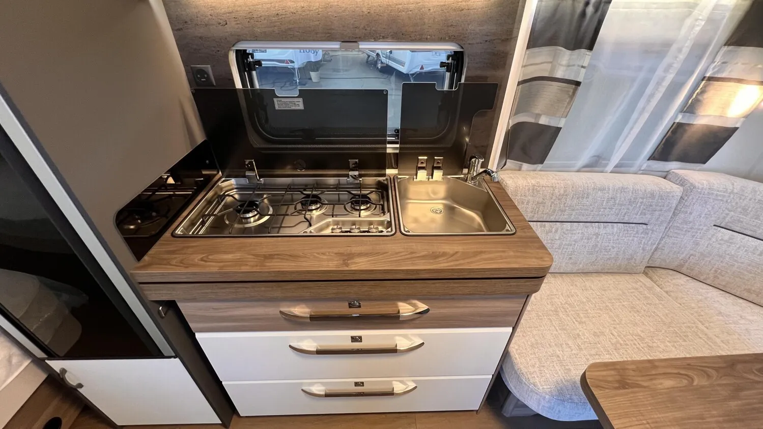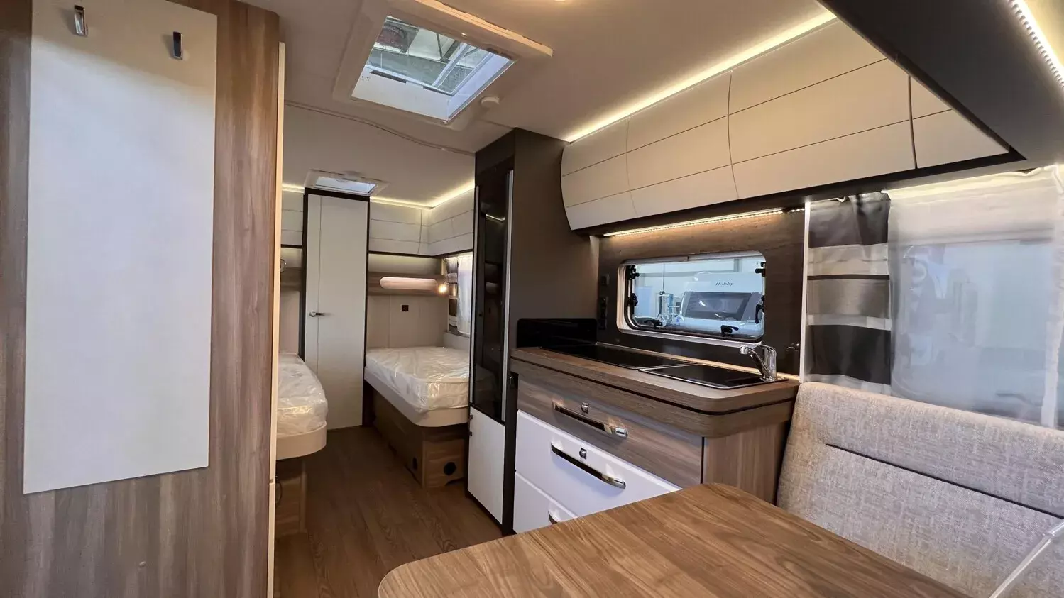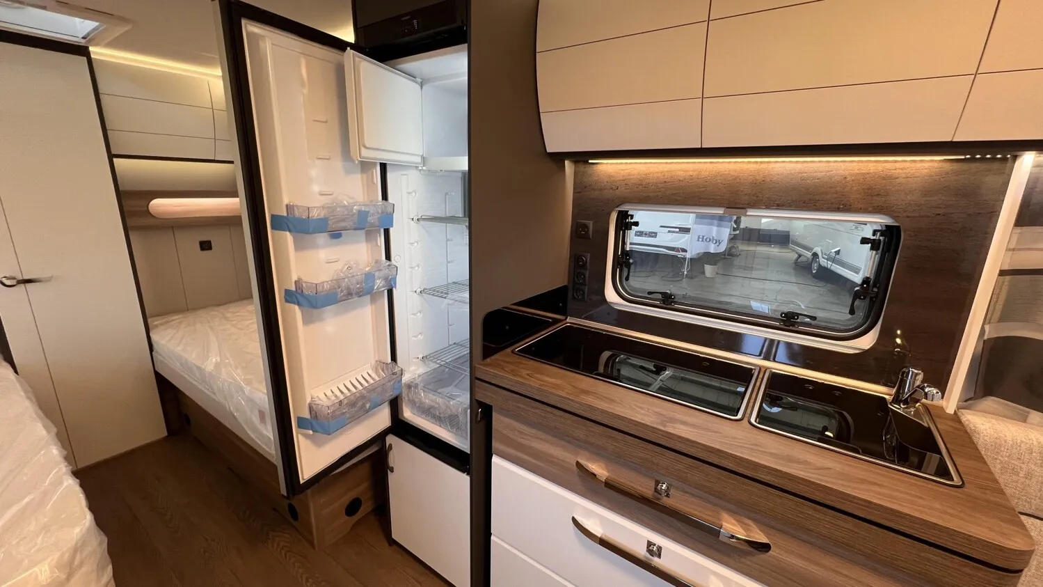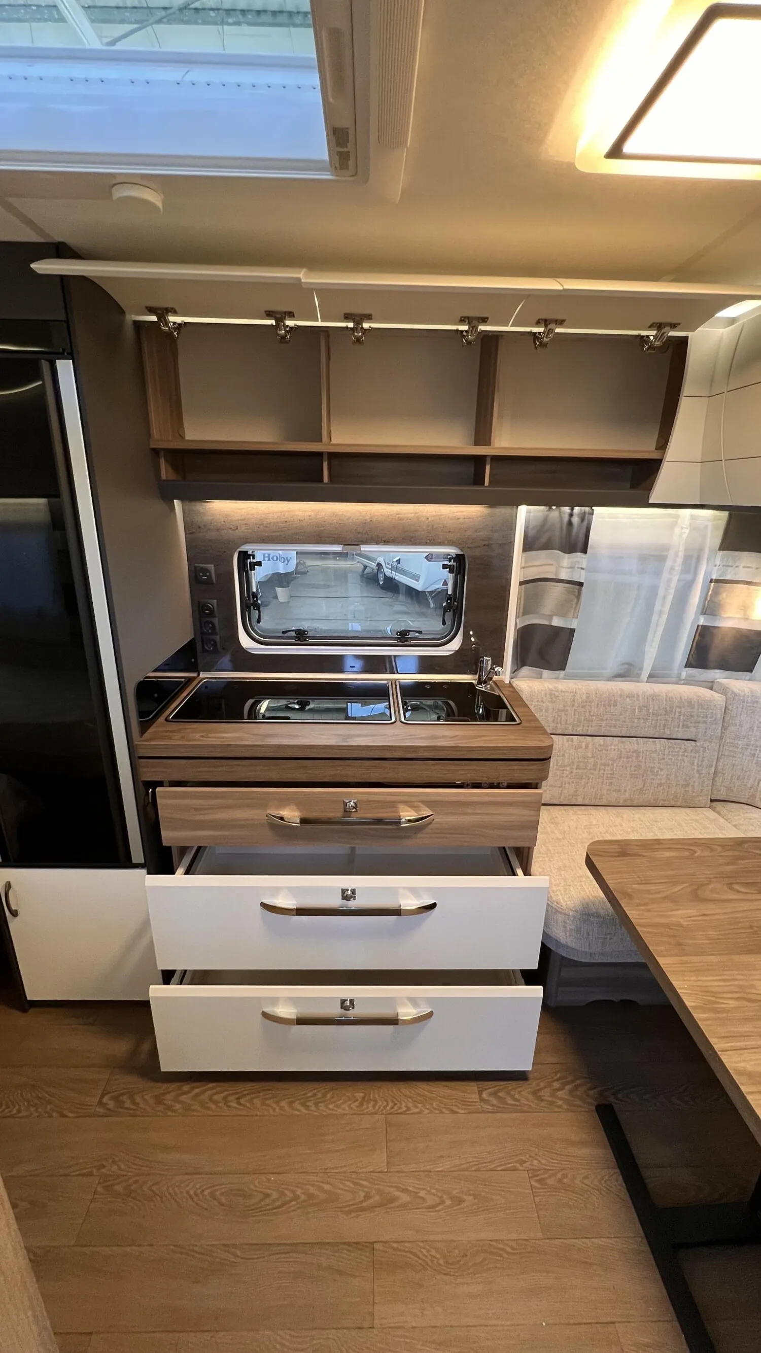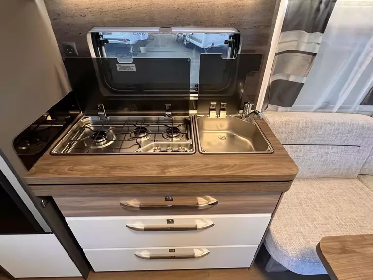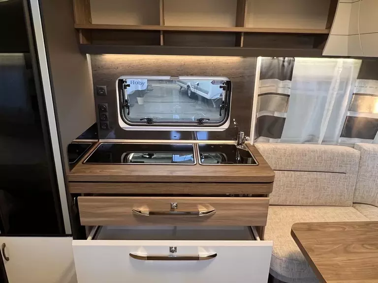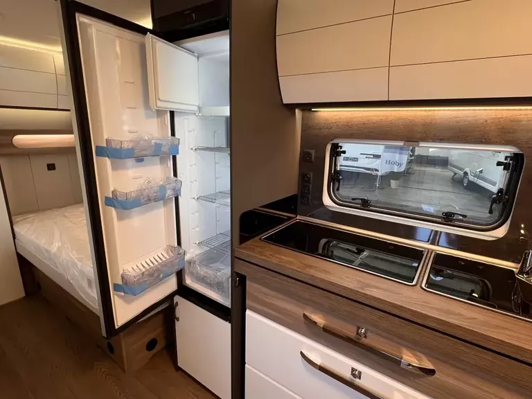 HOBBY-KOMPLETT-VOLLAUSSTATTUNG beinhaltet folgende Aussstattungen: Antischlingerkupplung KNOTT; Auflaufbremssystem KNOTT ANS mit automatischer Bremsnachstellung; Deichselabdeckung; Radstoßdämpfer; Schwerlaststützen; Zulassung auf Tempo 100; Kombikassetten mit Verdunkelungs- und Insekteschutz; Vorhängefenster, ausstellbar, doppelt verglast und getönt; Eingangstür einteilig, extrabreit mit Dreifachverriegelung, Fenster, Abfallseimer, Staufächern und Insektenschutzplissee im Türrahmen, Ausführung modellabhängig; Gasflaschenkasten passend für 2x 11-kg-Flaschen; Integrierte Vorzeltleiste; LED-Vorzeltleuchte; Radkastenblende mit Gummilippe für Windschürze; Stauraumklappe (modellabhängig); Kleiderschrank mit Innenbeleuchtung; Kühlschrank Dometic mit Frostfach; Kocher und Spüle; Federkernmatratzen bei Einzelbetten, Queensbetten und französischen Betten; Toilette THETFORD; Abwassertank rollbar ca. 23,5 Ltr; Frischwassertank, modellabhängig; Rauchmelder; Truma Heizung; Vorbereitung Dachklimaanlage; Hobby Connect; uvm.