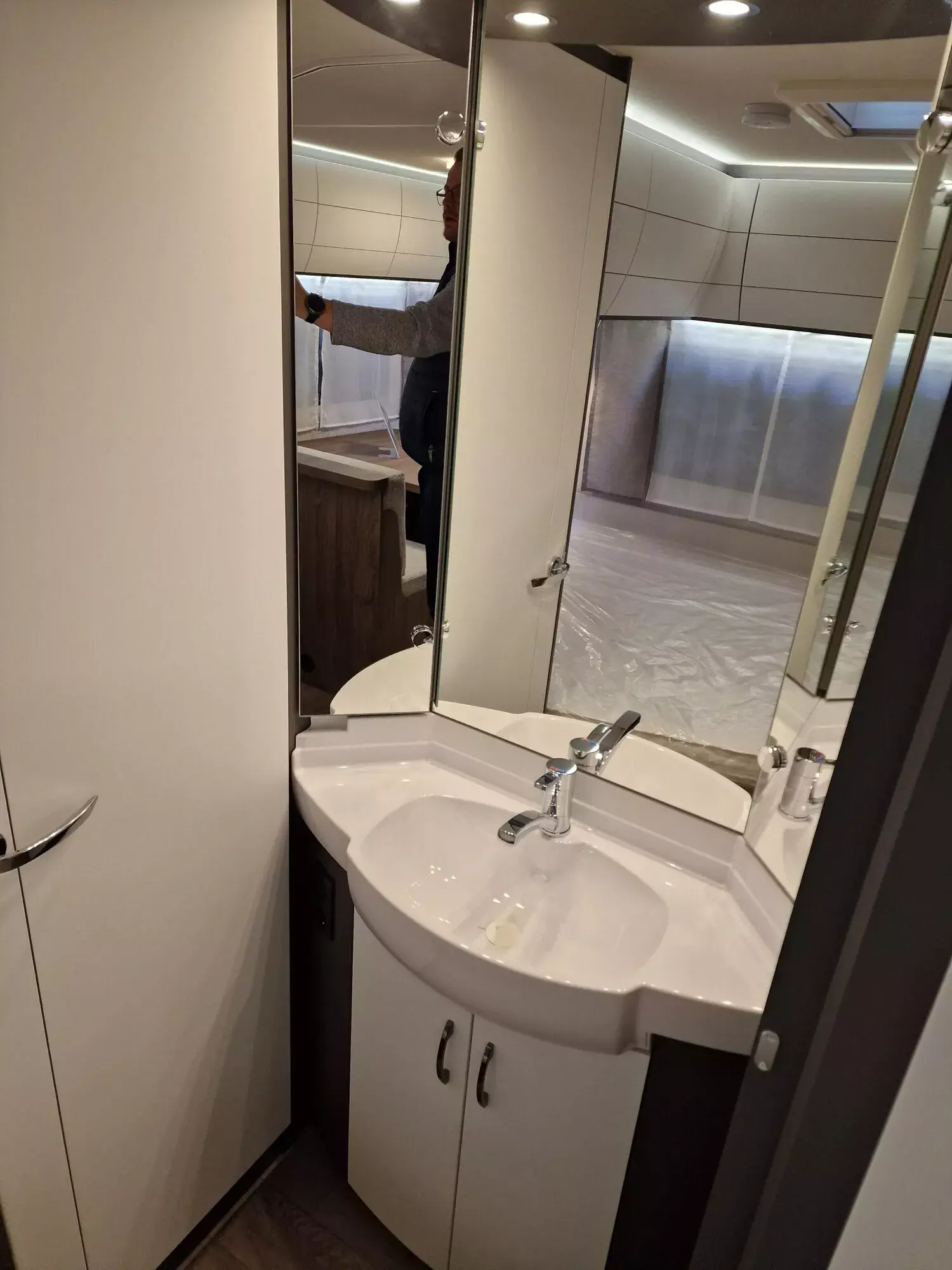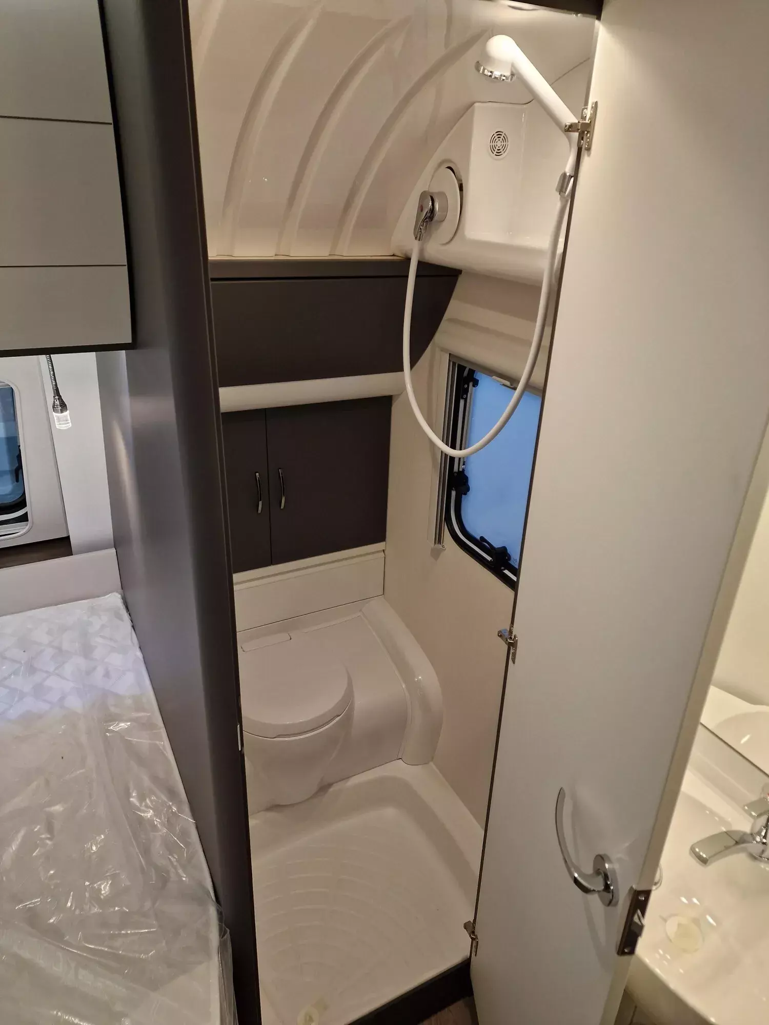- Duscharmatur und Duschvorhang für Waschraum mit externem Waschtisch
