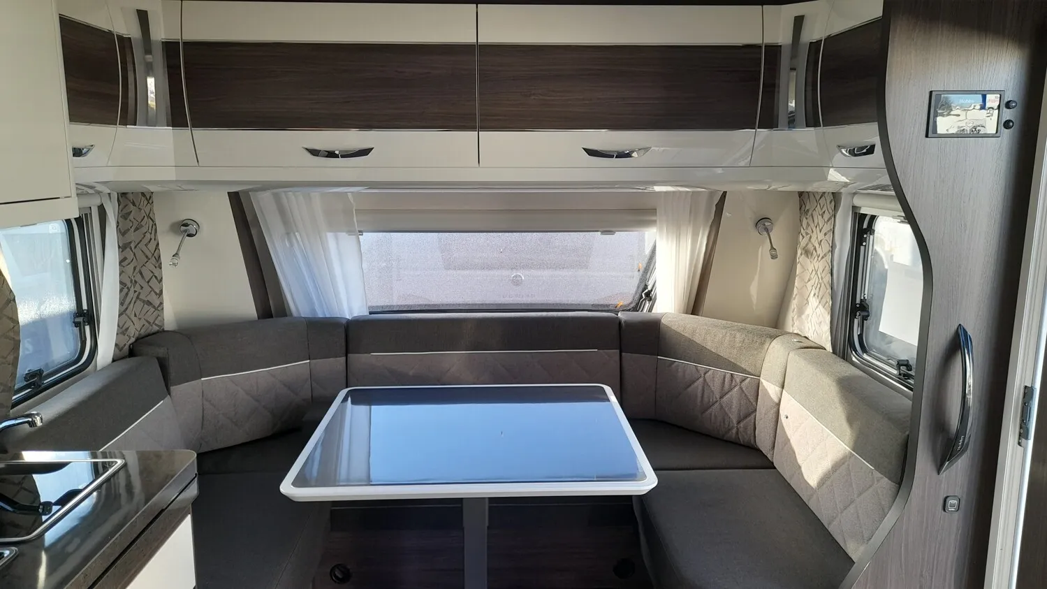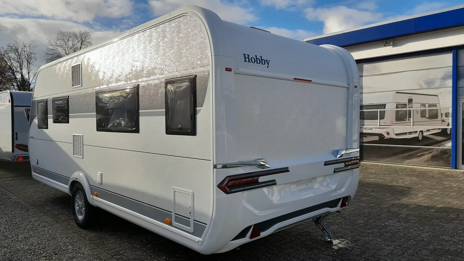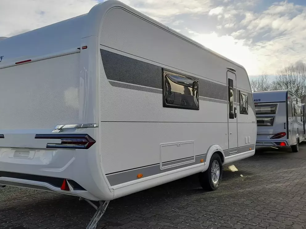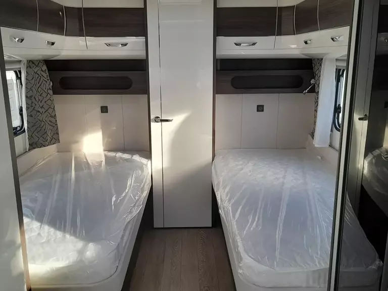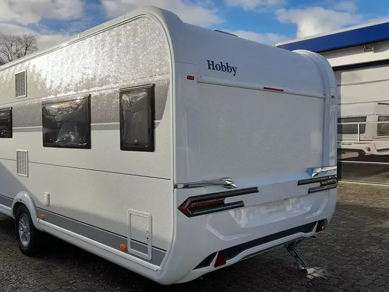 Hobby Prestige 560 WLU, Modell 2025, mit Einzelbetten Heckbad über die gesamten Fahrzeugbreite mit separter Dusche, Rundsitgruppe im Bug.