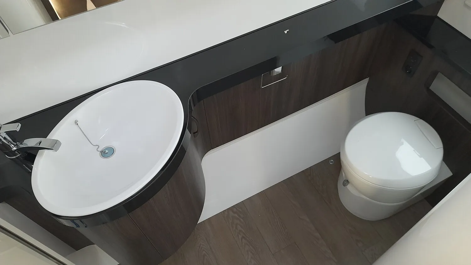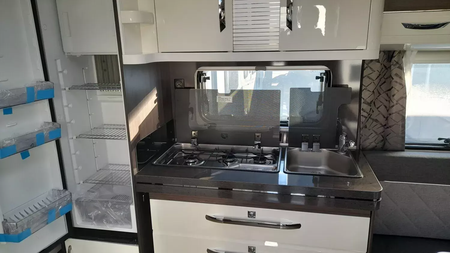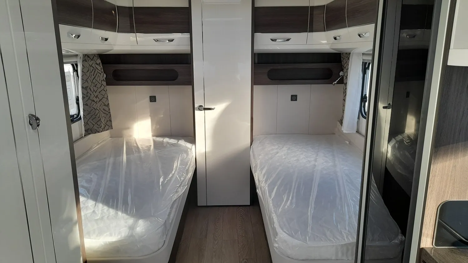 Hobby Prestige 560 WLU, Modell 2025, mit Einzelbetten Heckbad über die gesamten Fahrzeugbreite mit separter Dusche, Rundsitgruppe im Bug.