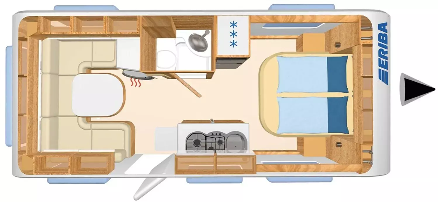 - Komfort-Paket ERIBA Exciting (Frischwassertankanzeige, Ambiente-Beleuchtung, Warmwasserversorgung Truma-Therme, Tischdecke, Fliegenschutz-Rolltür (gesamte Türhöhe) bedienfreundlich durch seitliche Führung, Kunststoffabdeckung für Zugdeichsel, Tagesdecke, 2 Kissen mit Bezug)