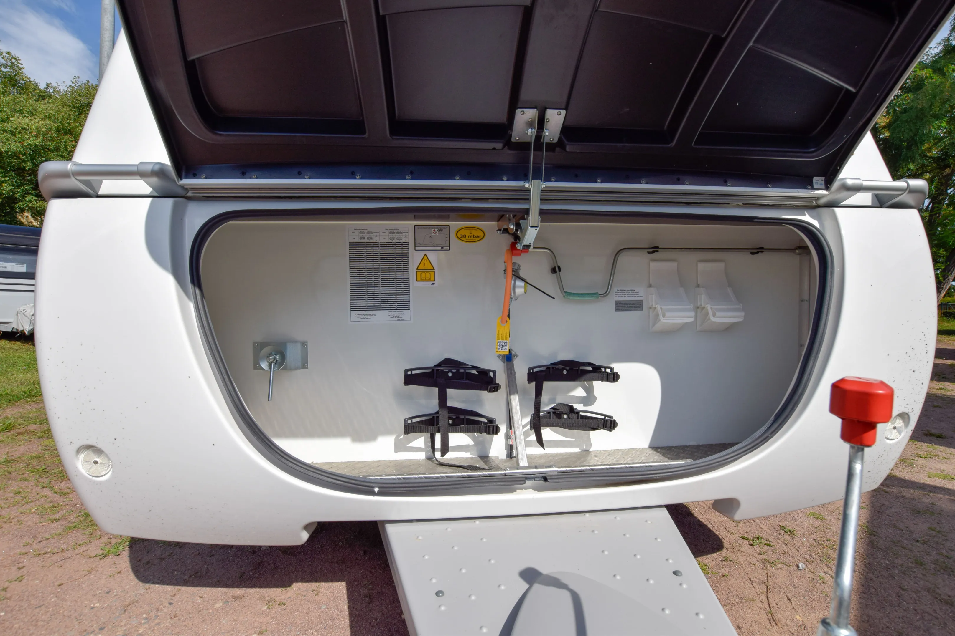 - Elegance-Paket (Abdeckung für Zugdeichsel, Seitenwände in Glattblech, Farbe Crystal Silver, Designabklebung Elegance, Leichtmetallfelgen ERIBA 5-Stern-Doppelspeiche, silber)
