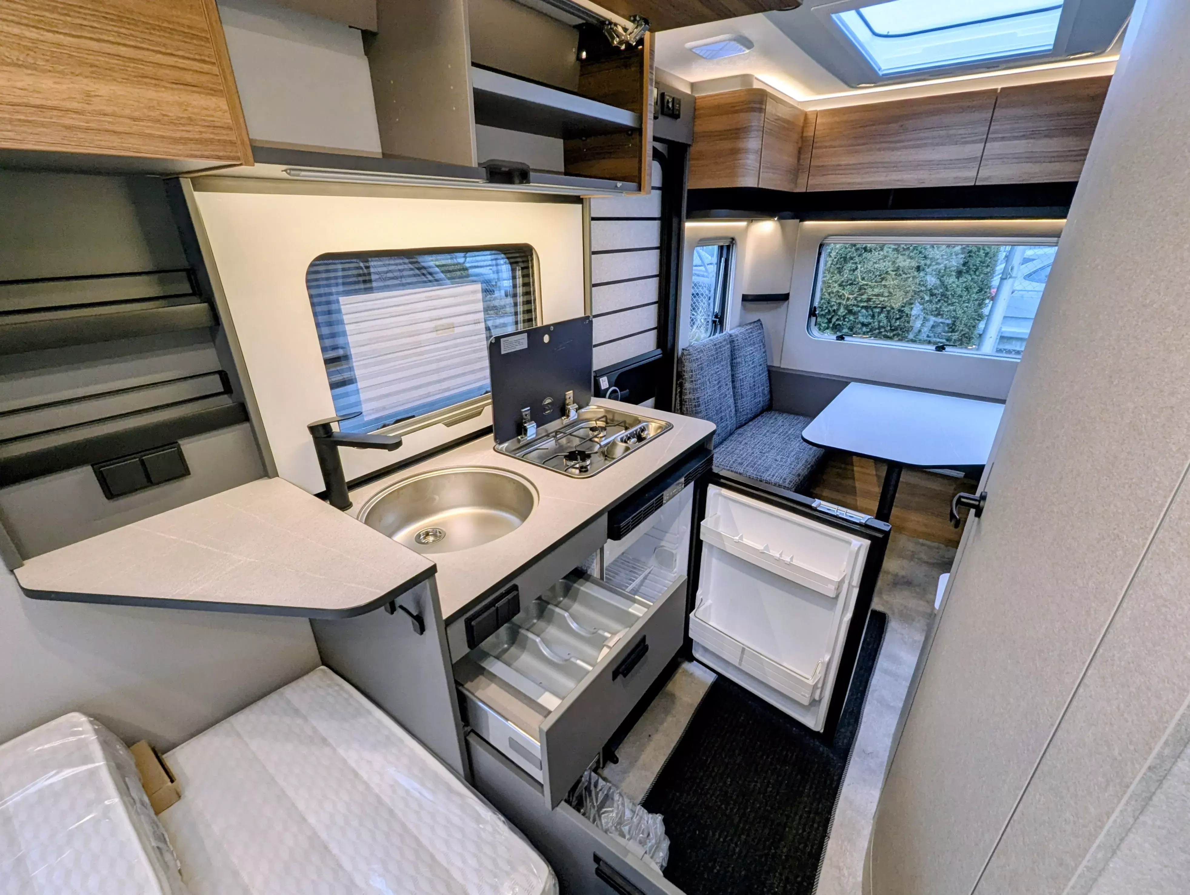 - Steckdosenpaket (2 x 230 V Steckdosen in Wohnraum und Küche) und 1x USB Doppelsteckdose (in Wohnraum)