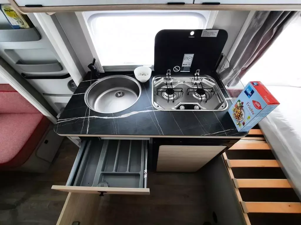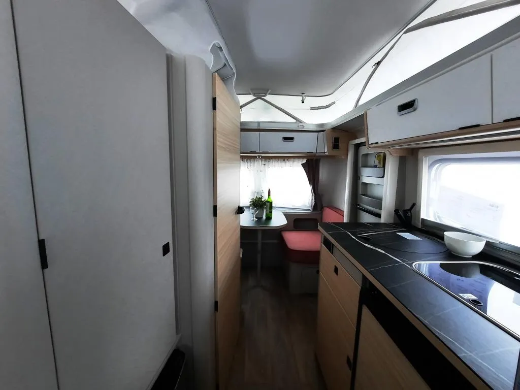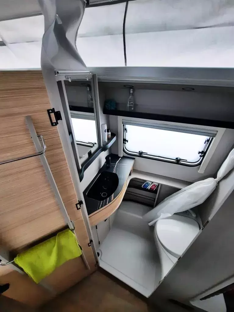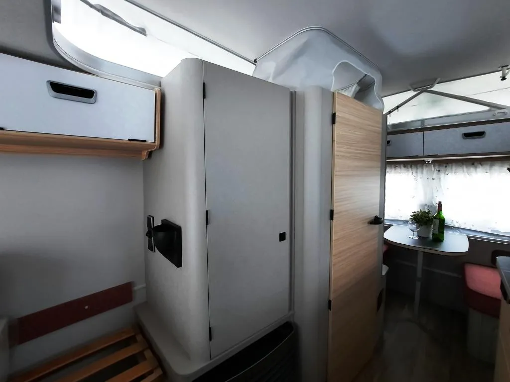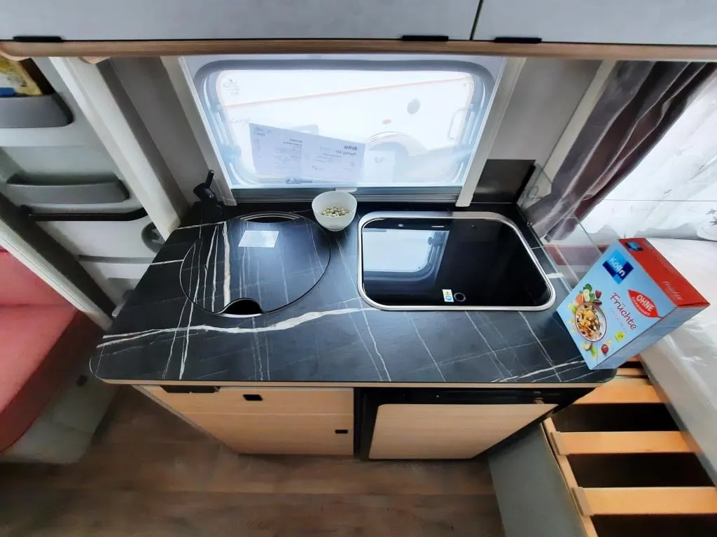 - Komfort-Paket (Fliegenschutz-Rolltür (gesamte Türhöhe), bedienfreundlich durch seitliche Führung, Komfort-Plissee-Rollos, Steckdosenpaket (2x 230 V Steckdosen und 1x USB-Doppelsteckdose), Abfalleimerin Eingangstür integriert, Spülenabdeckung mit Schneidebrett für Edelstahlspüle, zusätzlicher Vergrößerungsspiegel mit Magnethalterung)