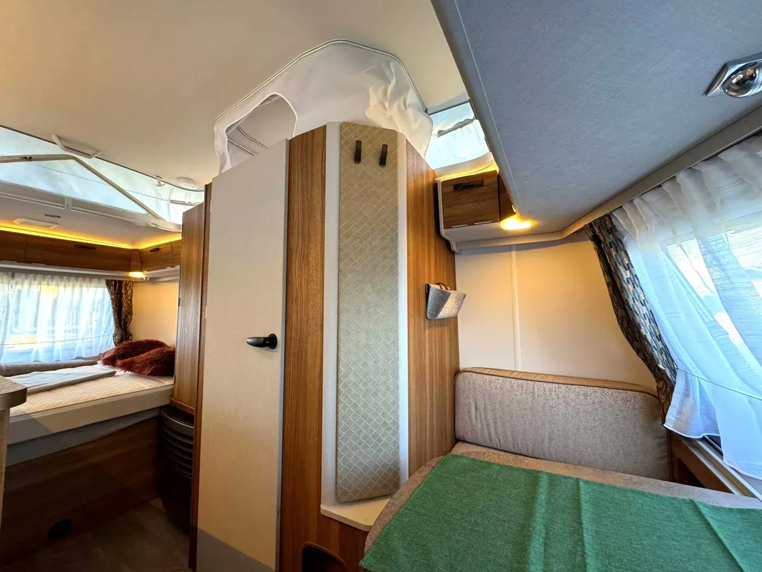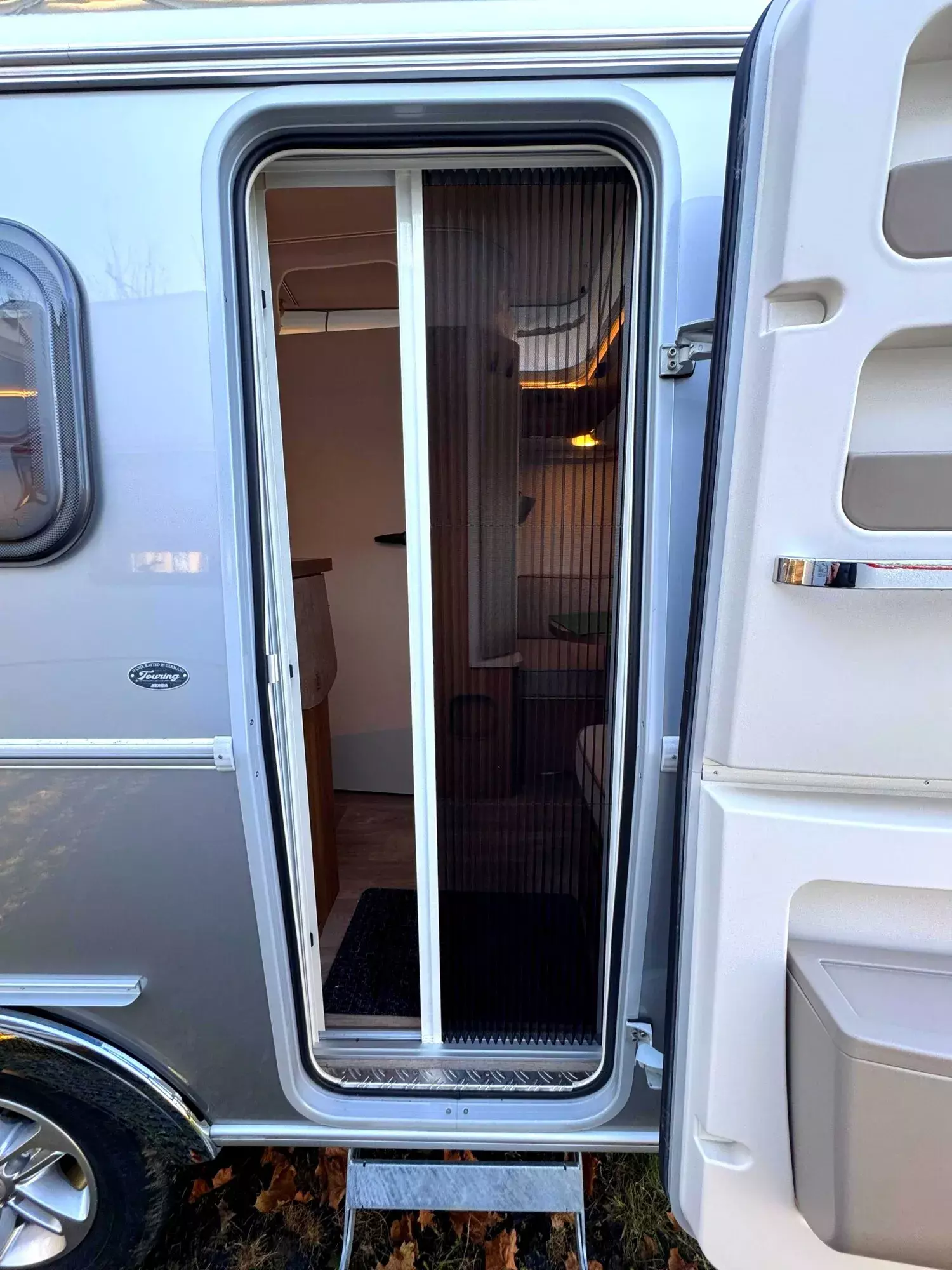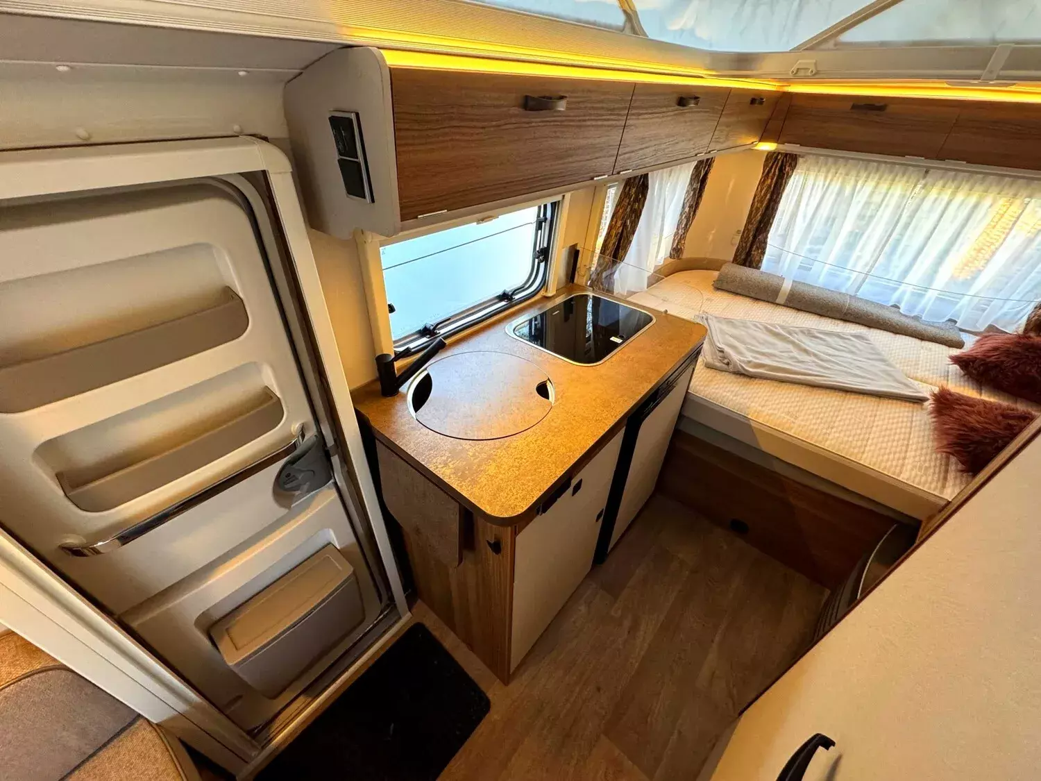 - Komfort-Paket (Fliegenschutz-Rolltür (gesamte Türhöhe), bedienfreundlich durch seitliche Führung, Komfort-Plissee-Rollos, Steckdosenpaket (2 x 230 V Steckdosen und 1 x USB-Doppelsteckdose), Abfalleimer in Eingangstür integriert, Spülenabdeckung mit Schneidebrett für Edelstahlspüle, Zusätzlicher Vergrößerungsspiegel mit Magnethalterung)