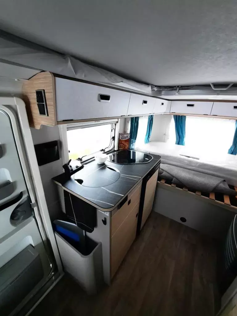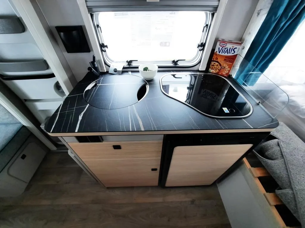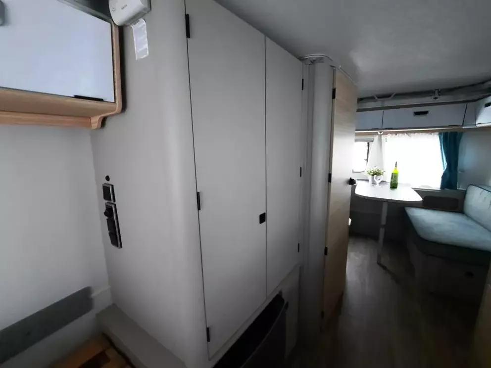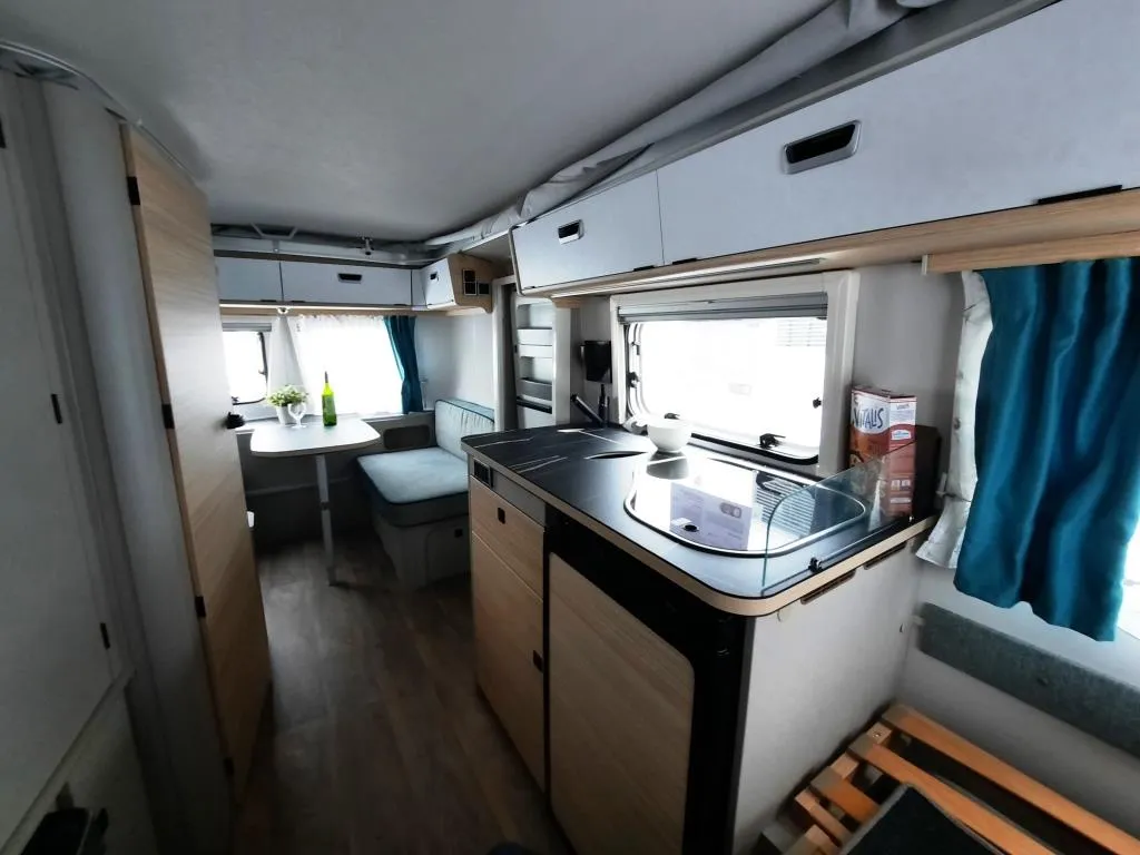 - Komfort-Paket (Fliegenschutz-Rolltür (gesamte Türhöhe), bedienfreundlich durch seitliche Führung, Komfort-Plissee-Rollos, Steckdosenpaket (2x 230 V Steckdosen und 1x USB-Doppelsteckdose), Abfalleimerin Eingangstür integriert, Spülenabdeckung mit Schneidebrett für Edelstahlspüle, zusätzlicher Vergrößerungsspiegel mit Magnethalterung)