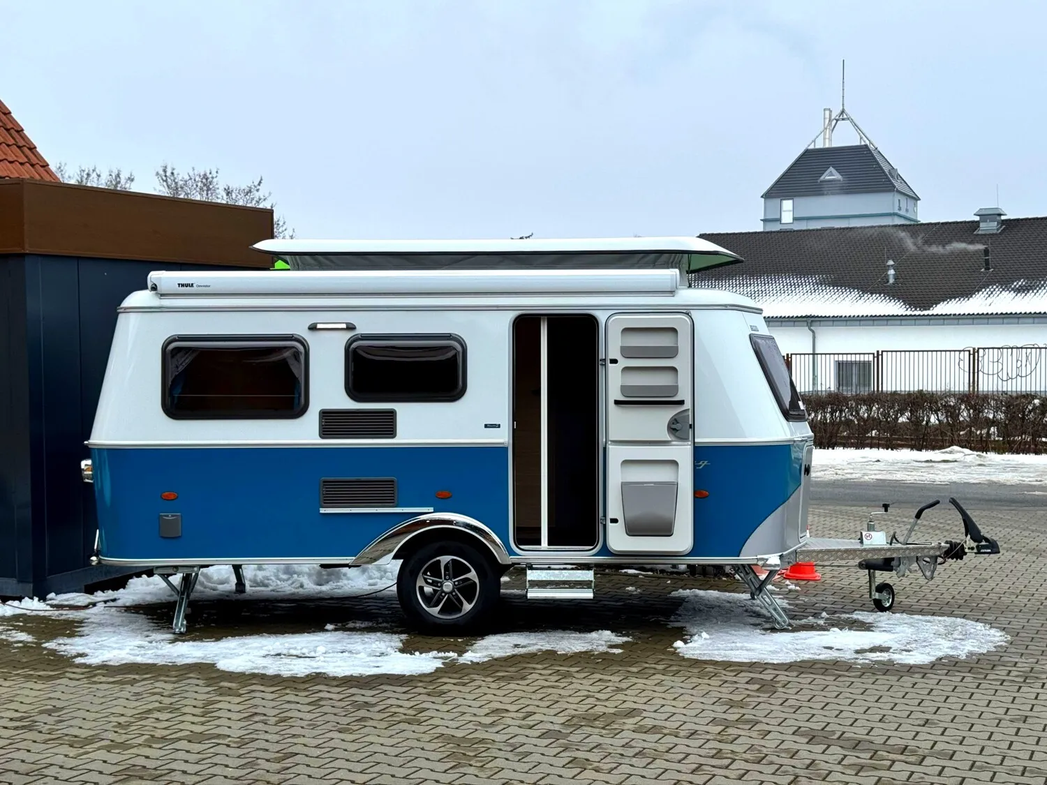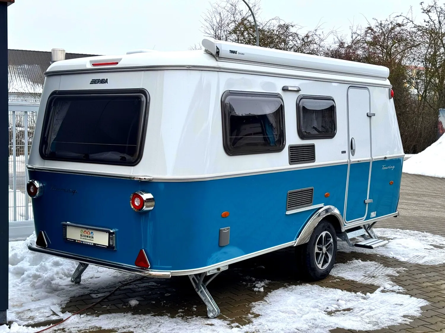- Harbour Blue Edition (Seitenwände, Bug und Heck in Glattblech, Farbe White Harbour Blue, Stoffkombination Orlando für Ausstattungslinie Urban, Möbeldekor Tindari, Chrompaket mit Außenanbauteilen in Chrom und Radlaufblende sowie Rückleuchten in Retrodesign, Leichtmetallfelgen ERIBA 5-Stern-Doppelspeiche, anthrazit, Steinschlagschutzblech, Bumper aus Edelstahl, Ambientelicht XL mit indirektem Licht oberhalb der Dachstauschränke und zwei zusätzliche ERIBA Multifunktions-Akkuleuchten, 2 Kissen mit Bezug)